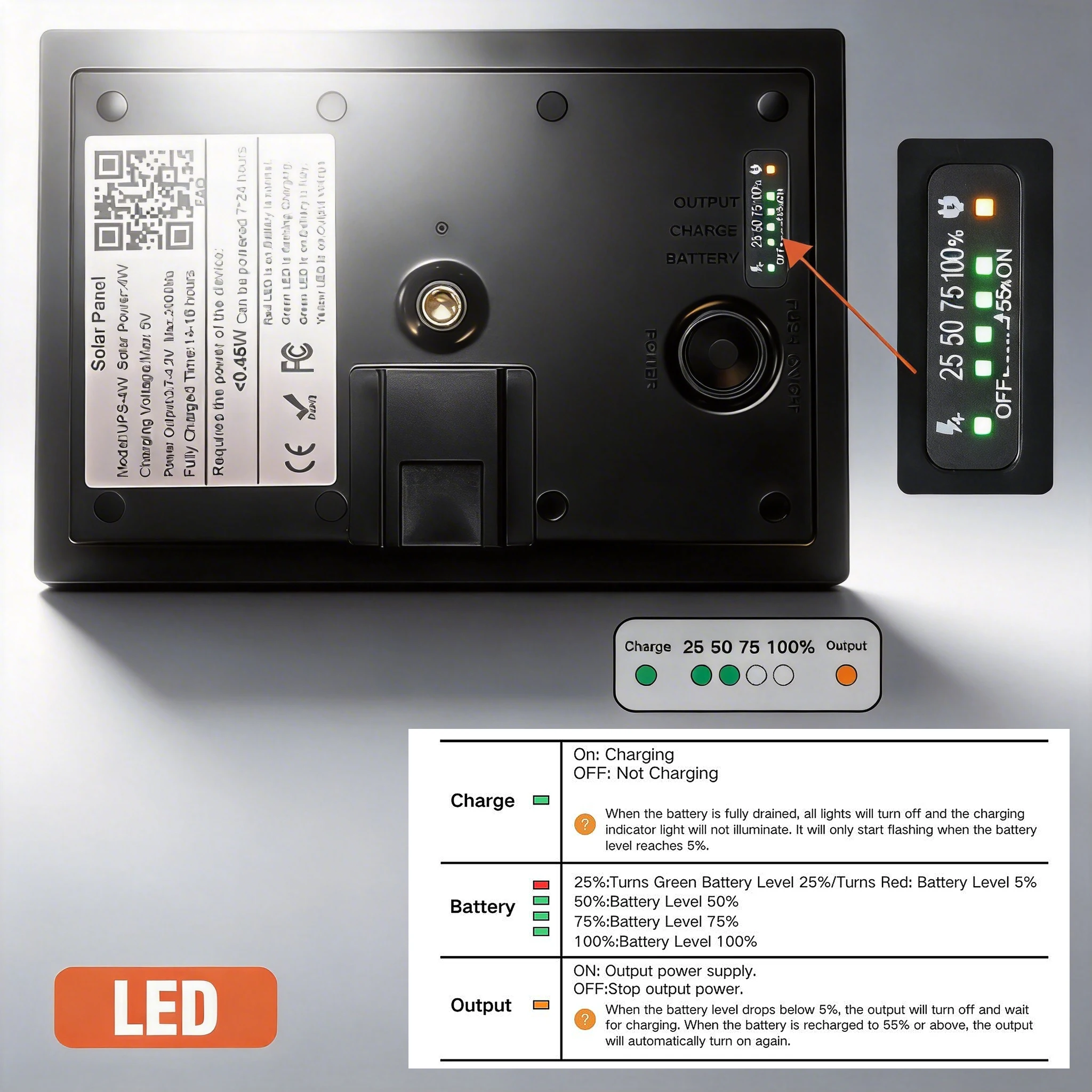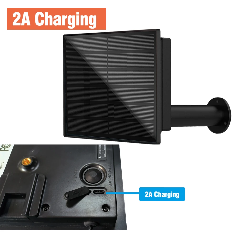 *【태양광 및 DC 전원 입력】패널은 두 가지 방법으로 충전할 수 있습니다. 햇빛을 통해 충전하거나 5V2A 전원 어댑터를 통해 패널의 배터리를 충전할 수도 있습니다.