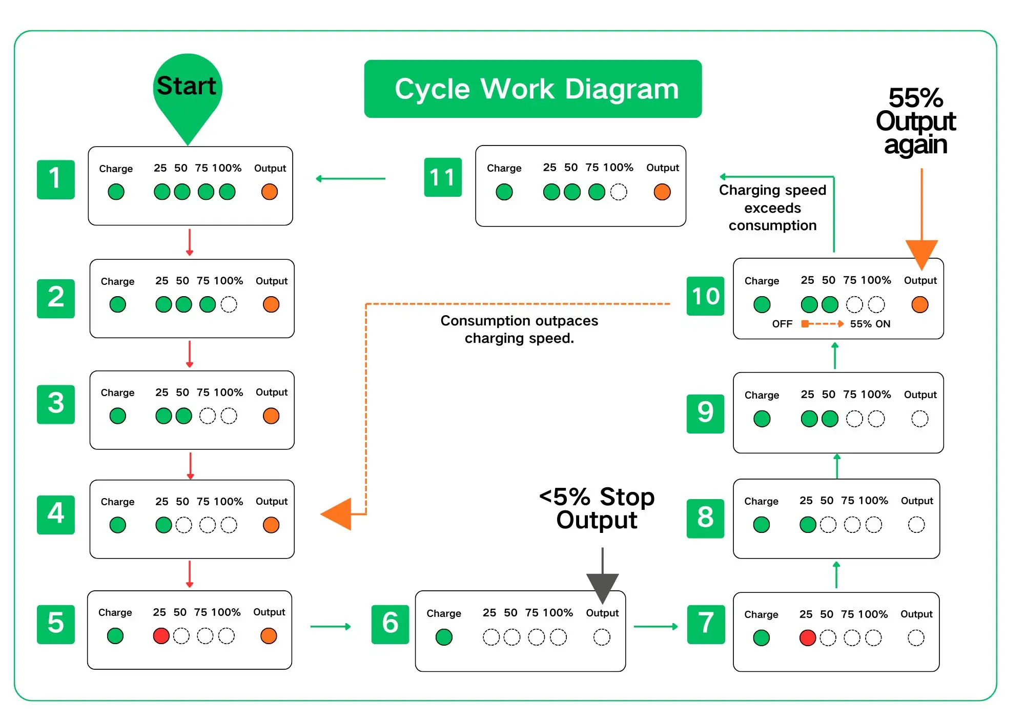 배터리 잔량이 5% 이하로 떨어지면 보호 프로그램이 활성화되어 전원 출력이 차단되고 충전을 기다립니다. 배터리가 55%까지 충전되면 수동 조작 없이 전원 출력이 자동으로 재개됩니다. 이 기능은 24시간 연속 작동을 지원합니다.