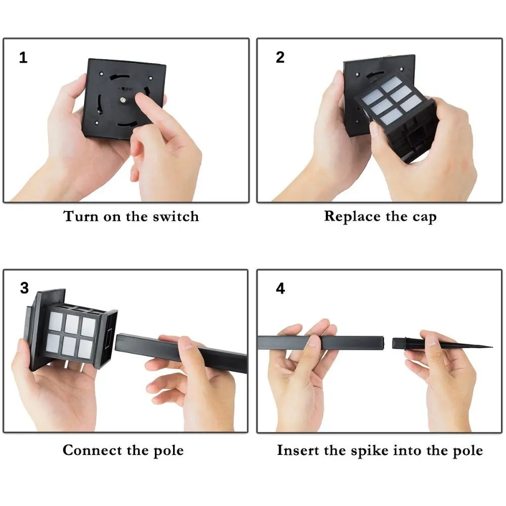 설치가 용이함: 캡 아래의 스위치를 켜고 말뚝을 흙에 밀어 넣습니다.이 태양광 경로 조명은 밤에 자동으로 켜지고 새벽에 꺼집니다!