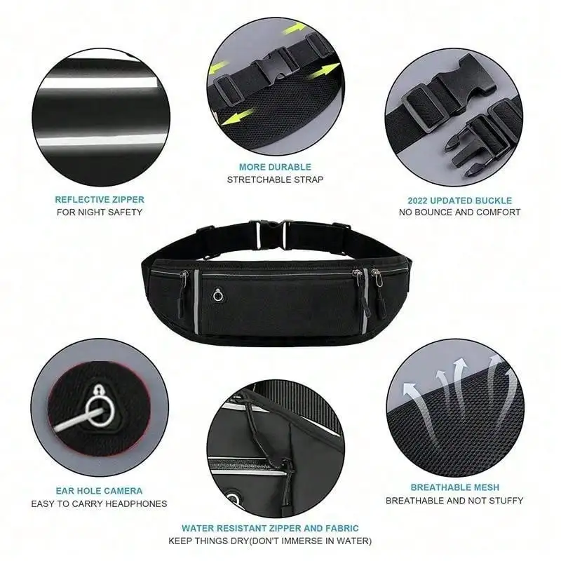 • 여러 개의 수납 포켓:여러 개의 포켓이 있는 이 허리 가방은 달리는 동안 열쇠, 휴대폰 및 기타 필수품을 보관할 수 있는 충분한 공간을 제공합니다.