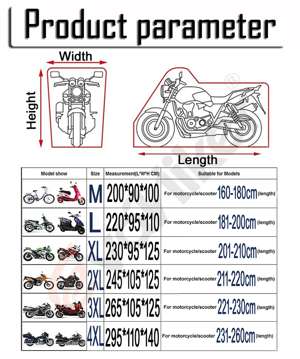오토바이의 길이 (오토바이에 트렁크가있는 경우 트렁크가있는 전체 길이) 는 오토바이 커버 길이보다 20CM 짧아야합니다! 선택 방법을 모르는 경우 언제든지 저희에게 연락하십시오!