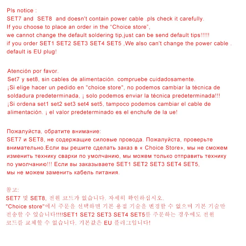 '선택 매장'에서 주문하기로 선택한 경우 기본 납땜 팁을 변경할 수 없으며 기본 팁만 보낼 수 있습니다!!!!!우리는 또한 전원 케이블을 변경할 수 없습니다. 기본값은 EU 플러그입니다!