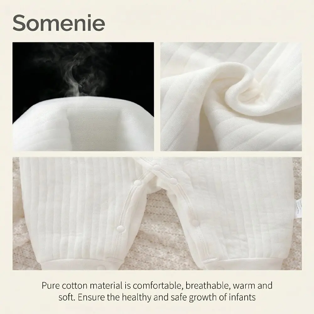 4. 가을, 겨울철 보온성을 높인 두툼한 디자인: 저희 아기 올인원은 두툼하게 제작되어 쌀쌀한 가을, 겨울철 아기를 따뜻하게 보호해 줍니다.두꺼우면서도 부드럽고 유연하여 아기가 자유롭고 편안하게 움직일 수 있습니다.