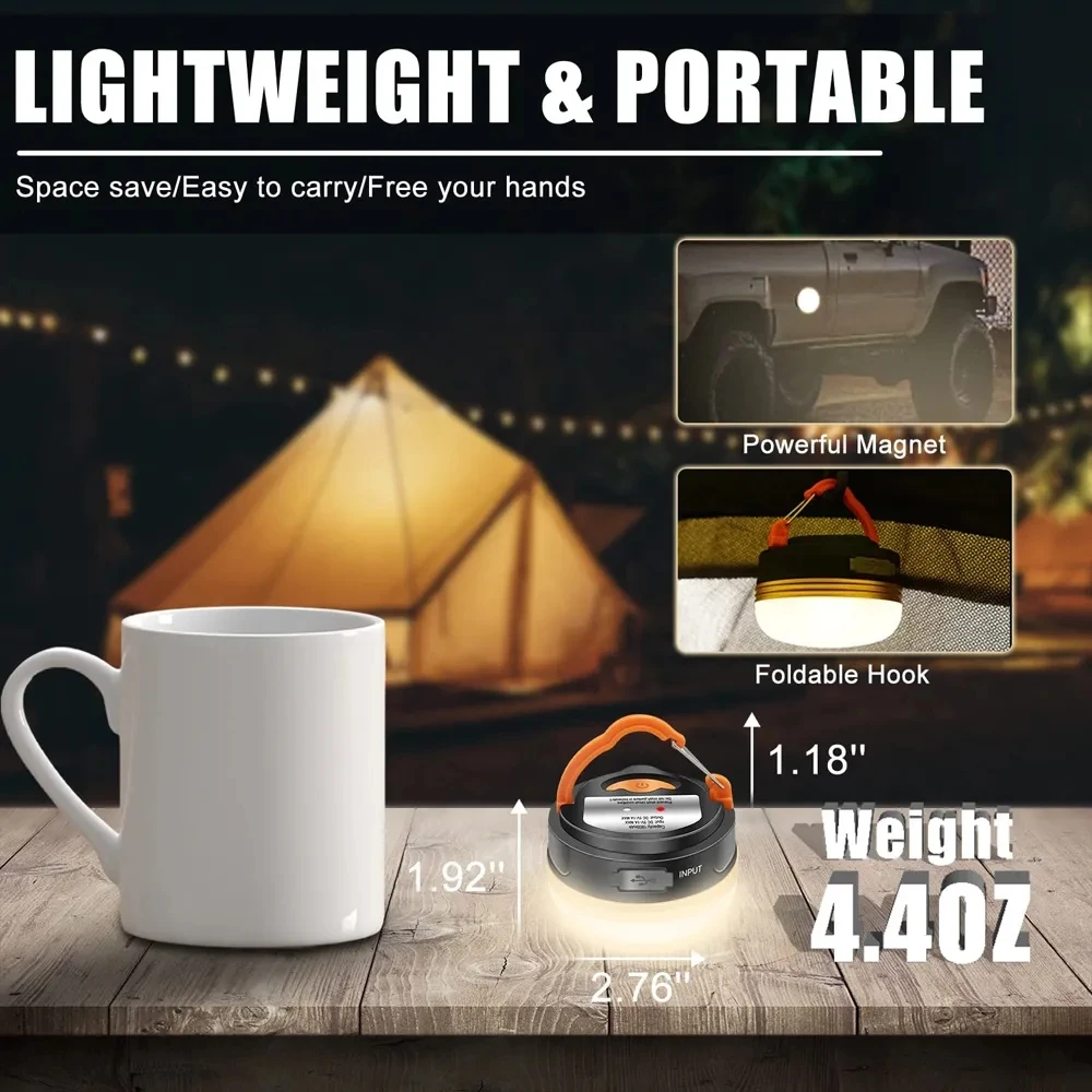 【Lightweight & Portable】The little camping light is only weight 4.46OZ--compact, lightweight, space save and easy to carry, perfect travel size. All-purpose foldable hook, can be hang it on tents or tree, with magnetic for metal surfaces, free your hands. The extremely lightweight design also fit for young child, a great gift for your loved ones.