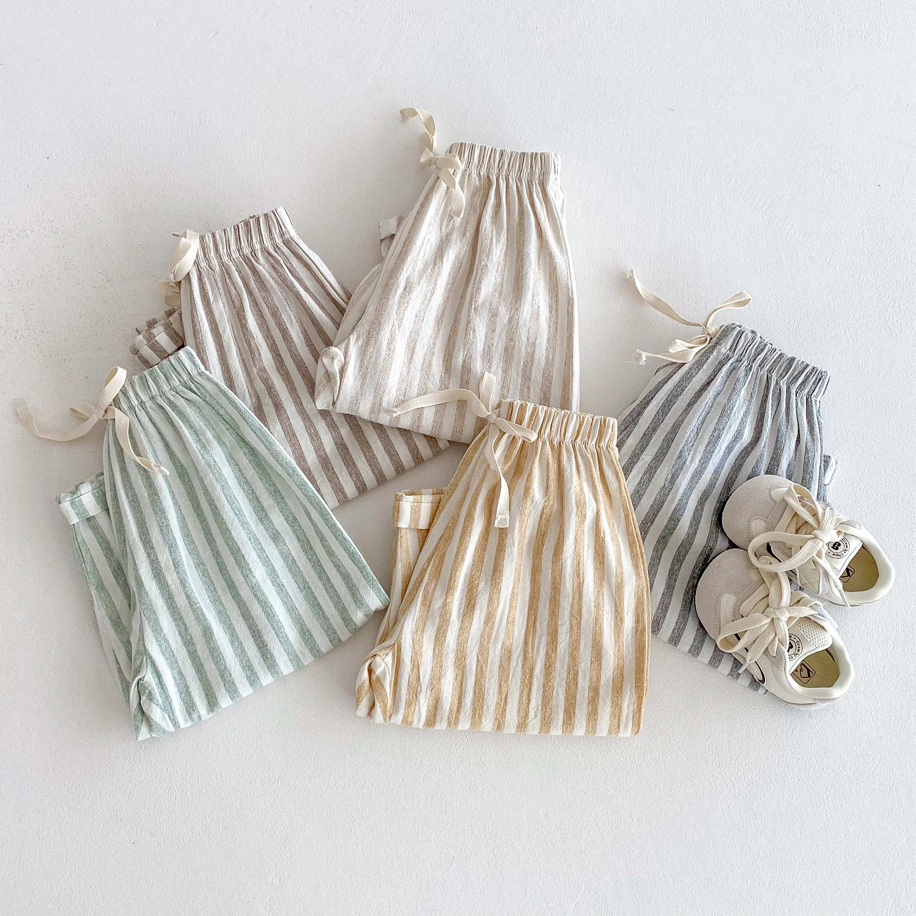 소년을위한 빈티지 리넨 코튼 스트라이프 바지 캐주얼 포켓 디자인 유아 소녀 의류 어린이 바지 아기 물건을위한 탄성 허리 바지