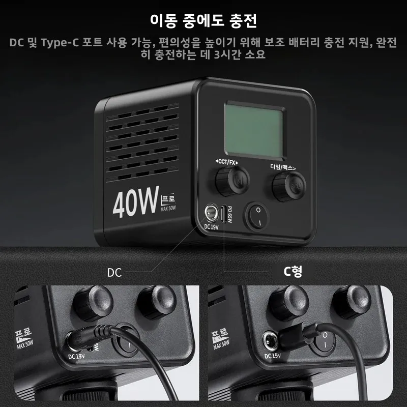 Tips: When charging with the DC port or Type-C port while using, the max power of the light is 40W. Please make sure that your charger and charging cable support charging with PD up to 65W. Charging cable is sold separately.
