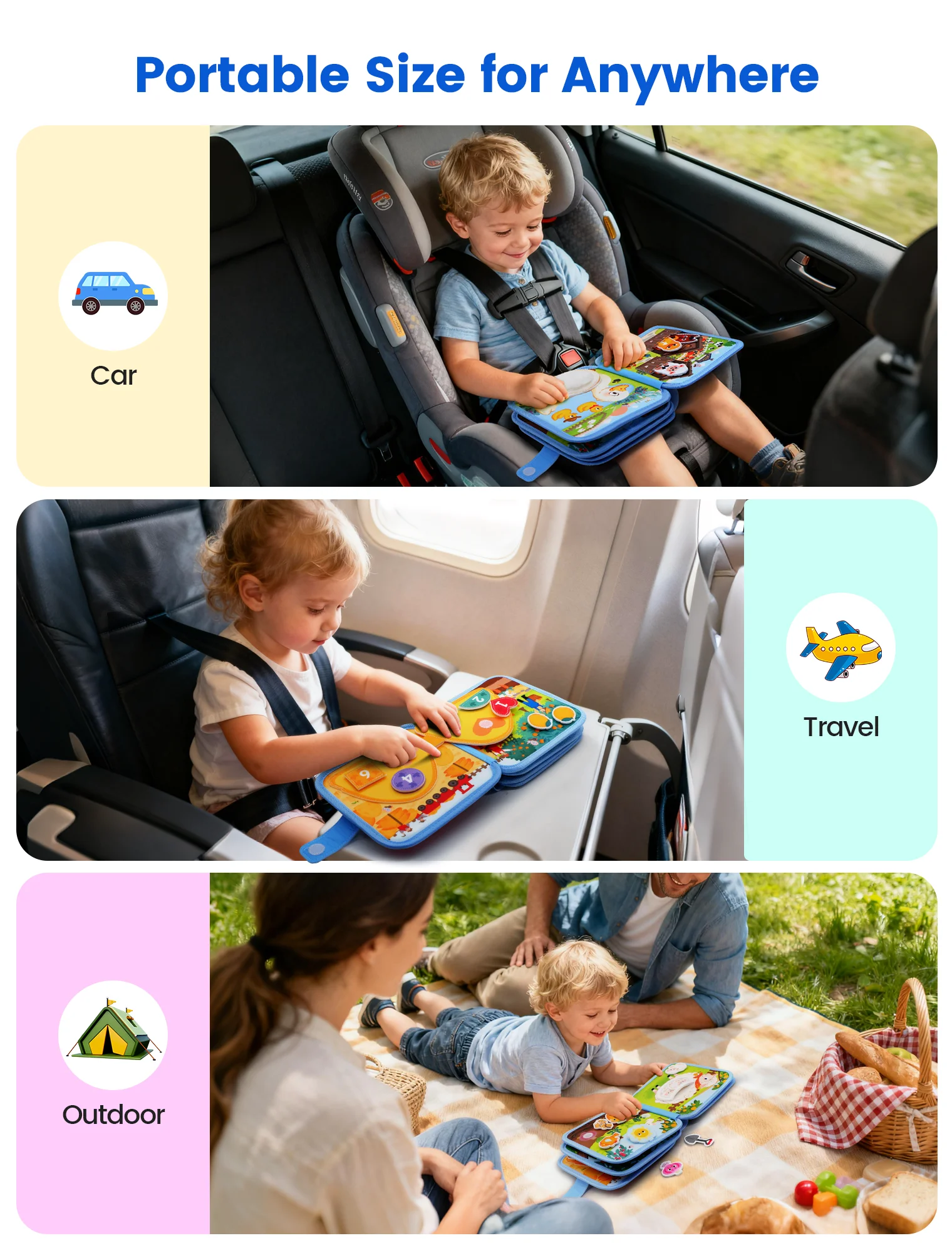 *휴대용 여행용 장난감:가볍고 컴팩트한 디자인으로 어디를 가든 무음책을 쉽게 가지고 다닐 수 있습니다. 모든 부품이 여행용 장난감 책에 포함되어 있어 여행에 적합하므로 자동차를 운전하거나 비행기에서 놀 때 아이가 더 이상 지루해하지 않습니다.