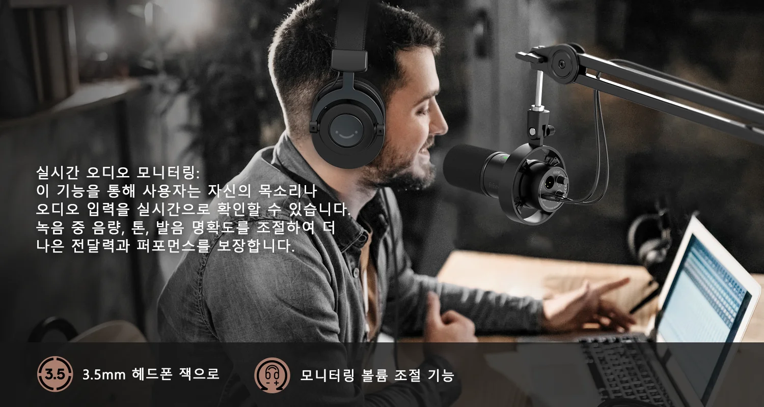 전체 기능 세트를 사용하면 게인 손잡이로 볼륨을 쉽게 조절할 수 있으며 LED 표시기를 사용하여 음소거하는 가벼운 터치로 마이크를 즉시 음소거할 수 있습니다. 모니터링 손잡이를 통해 모니터링되는 오디오 수준을 조정하는 경우에도 헤드폰 잭을 통해 실시간 오디오 모니터링을 경험해 보세요. 녹음 프로세스의 모든 수준을 제어할 수 있습니다.