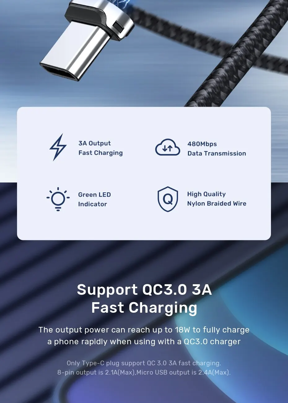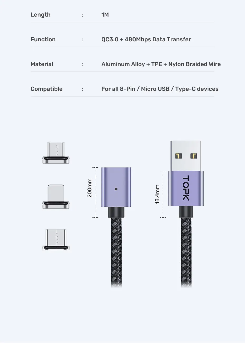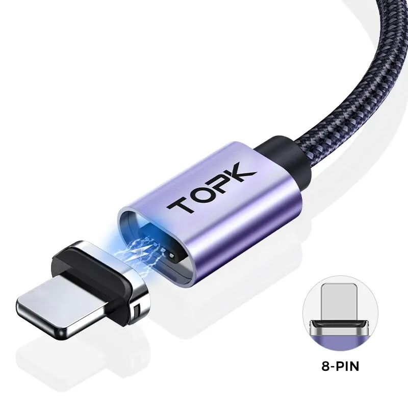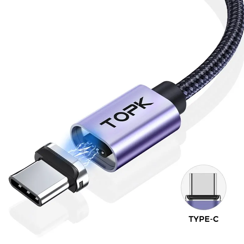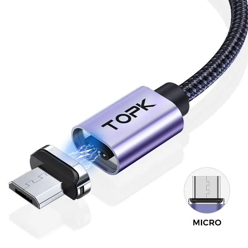 TOPK 3.3피트 6.6피트 자기 충전 케이블 3A, LED 조명이 포함된 USB C/마이크로 케이블, QC 3.0 고속 충전 및 데이터 전송 지원, iPhone, Android 장치용 나일론 편조 자석 휴대폰 충전기 코드