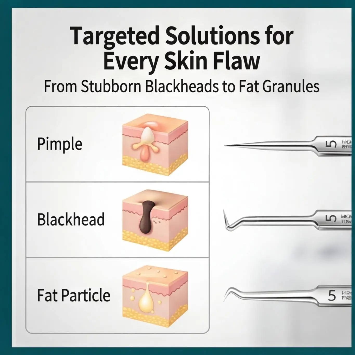 • 다용도 세트 :이 8종 세트는 여드름 압출기, 블랙헤드 압출기, 여드름 바늘 등 다양한 여드름 관리 도구를 포함하여, 모든 여드름 관리 니즈를 충족시켜 드립니다.