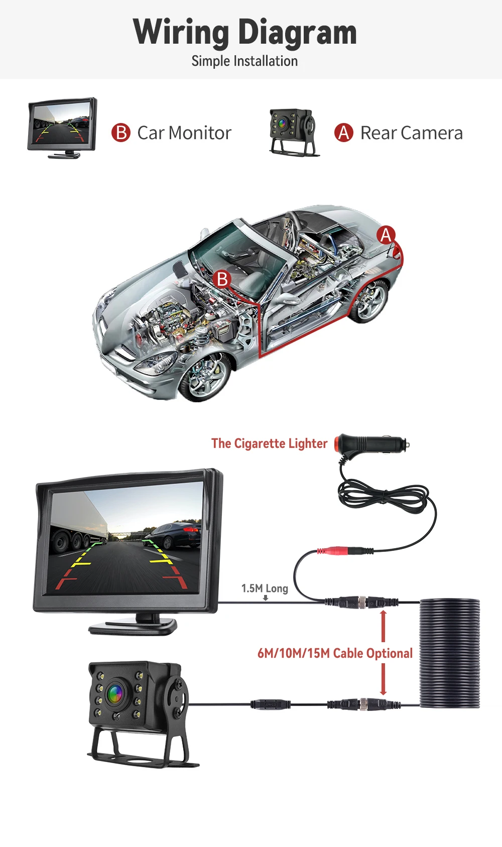 이 가격에 모니터와 카메라 일체형으로 전원 배선을 따로 안해도 되고 시거잭 스위치는 on, off시 램프 점등도 되고 카메라 램프는 어두운 곳에서 자동으로 점등 됩니다.
