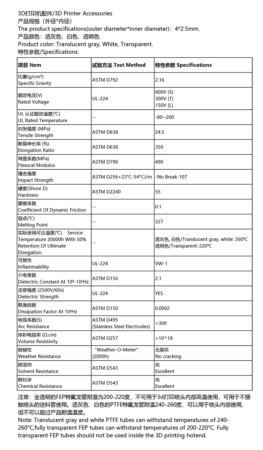 2.PTFE 튜브(흰색/회색)는 과열되면 성능이 저하됩니다. 열 제한 내에서 유지하십시오.