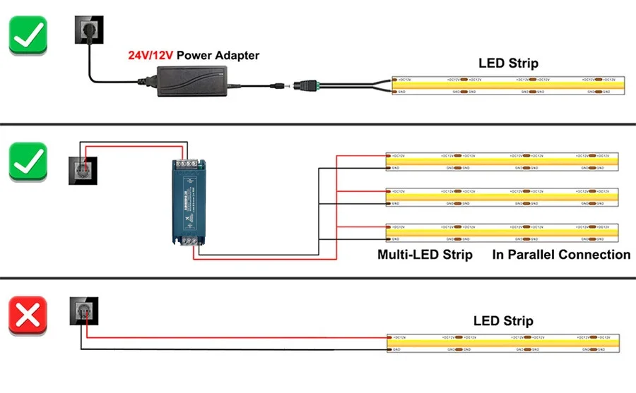 1.이것은 DC 전압 LED 스트립이므로 AC 110V 또는 220V에 직접 연결할 수 없습니다!