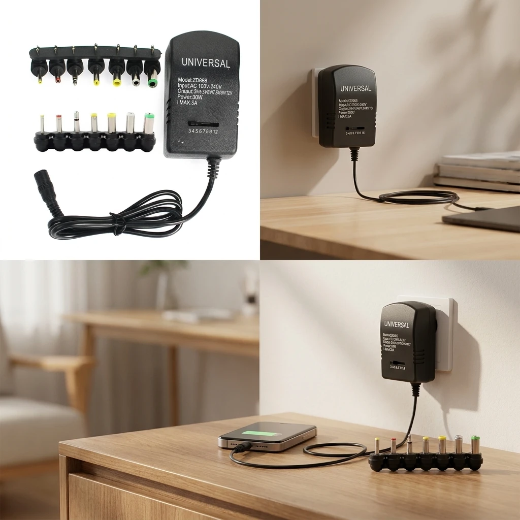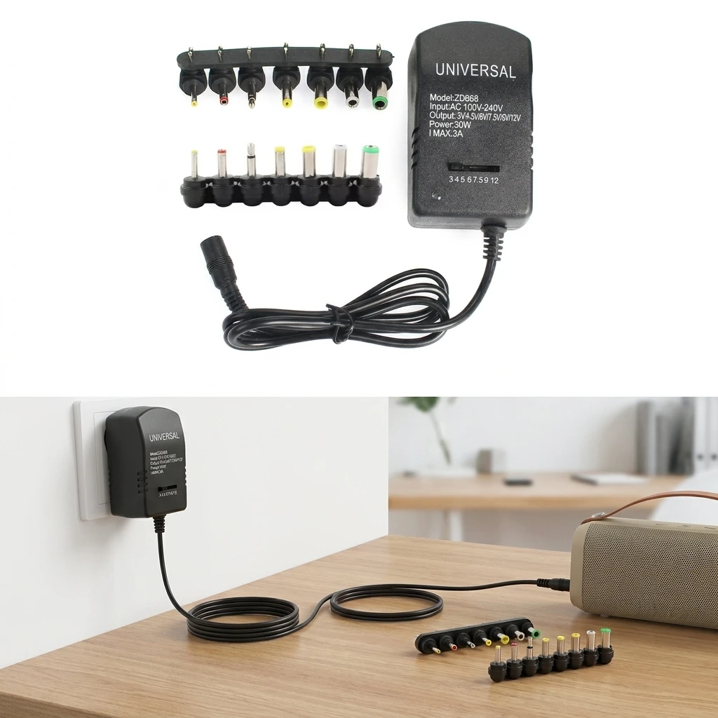 범용 조절식 전원 어댑터30W 다중 전압 전원 공급 장치, 100-240V AC를 DC 3V/4.5V/6V/7.5V/9V/12V로 변환하며, 최대 출력 전류는 3A입니다.