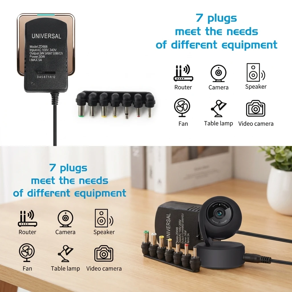 광범위한 호환성7개의 교체 가능한 DC 플러그가 포함되어 있으며, 전자 장난감, DVD/CD 플레이어, 디지털 액자, IT 장비, TV 게임 등 대부분의 소형 전자기기에 적합합니다.