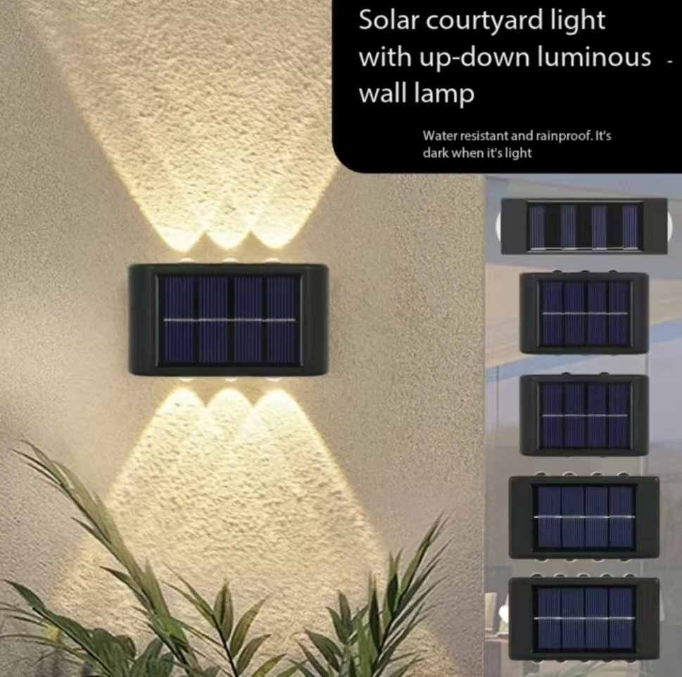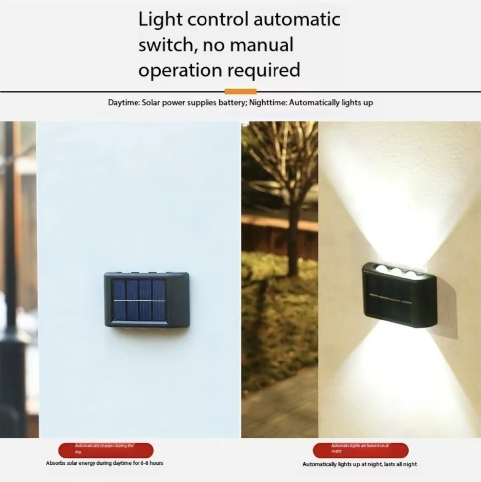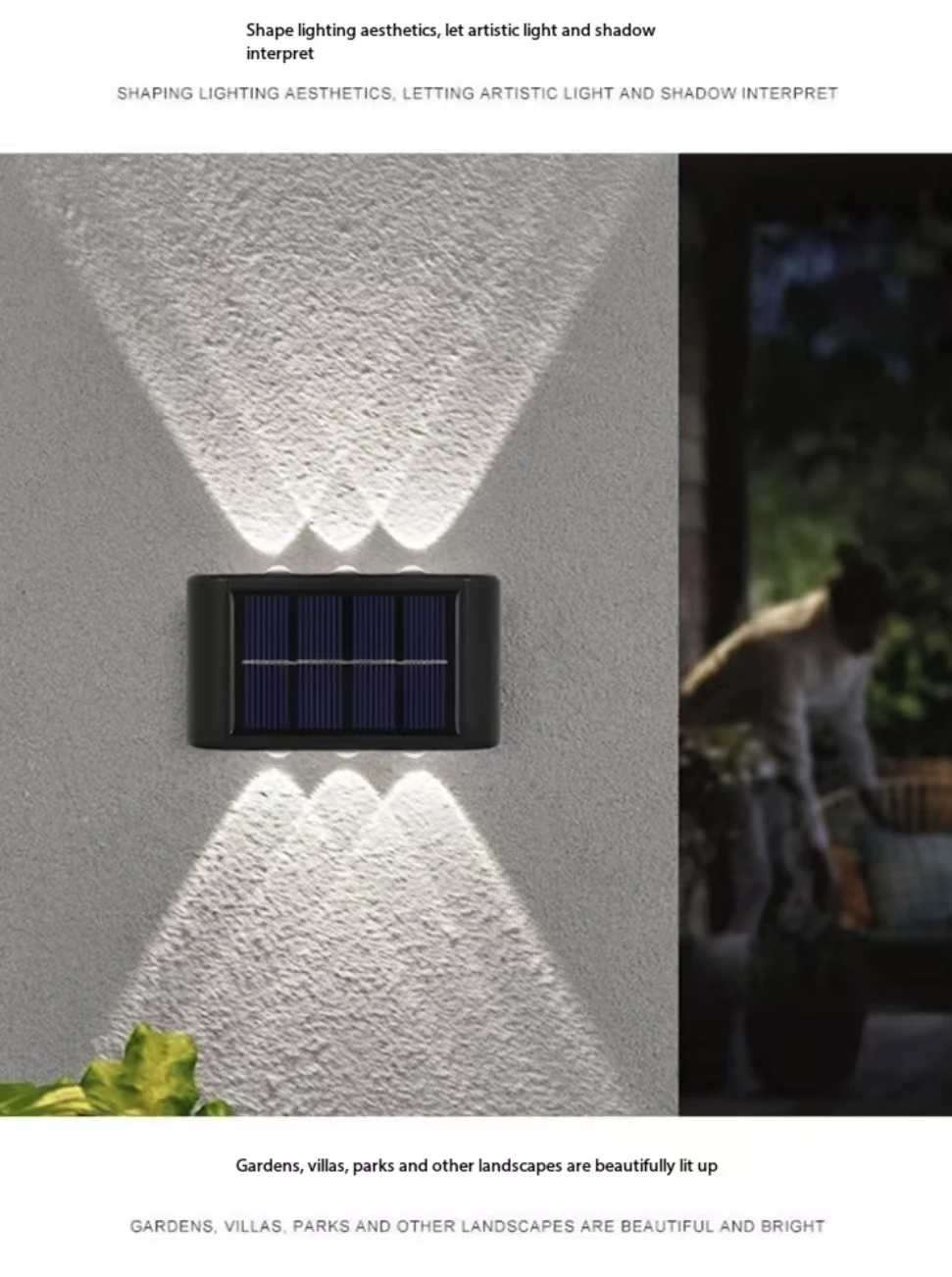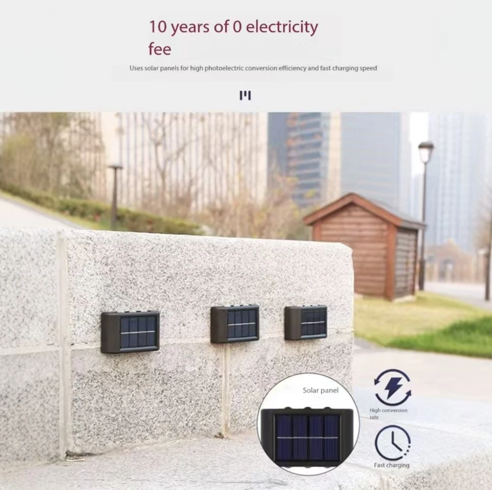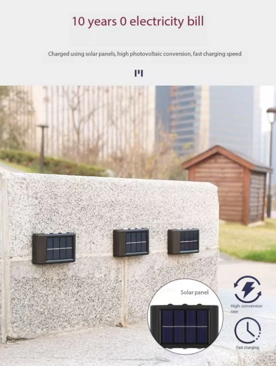 【태양광 벽 램프 실외 】태양광 실외 벽 램프는 상단과 하단 방출 디자인을 채택하고 상단과 하단에 3개의 LED 빔이 교대로 배열되어 램프의 밝기를 향상시킵니다.태양광 조명은 빛의 변화를 지능적으로 감지하고 낮에는 자동으로 충전되며 밤에는 자동으로 켜집니다.