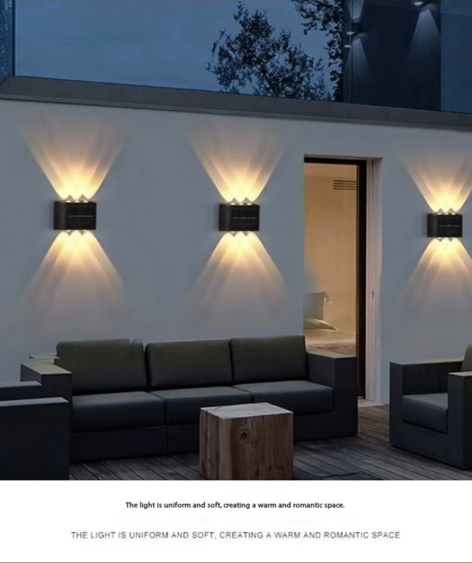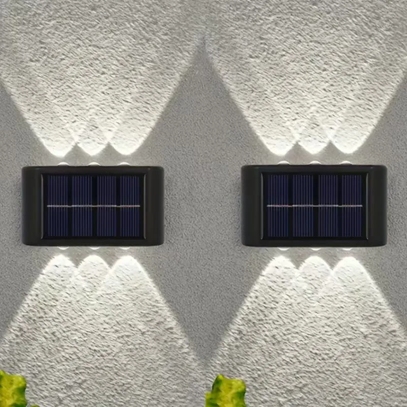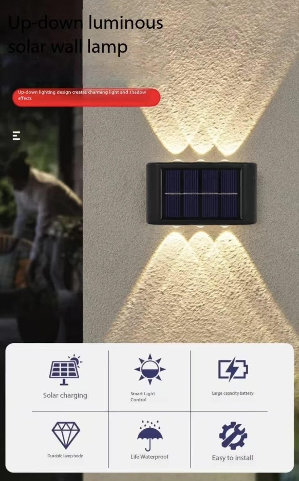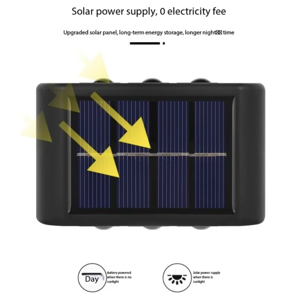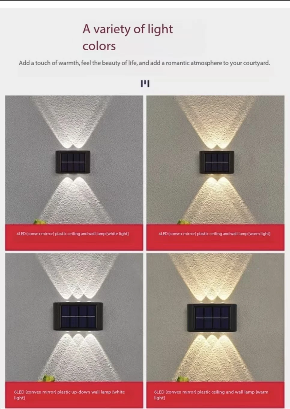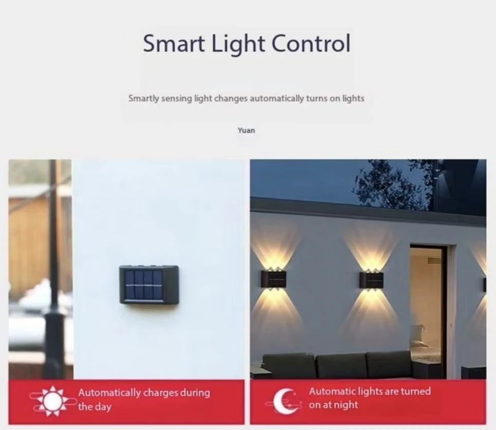 【태양광 벽 램프 실외 】태양광 실외 벽 램프는 상단과 하단 방출 디자인을 채택하고 상단과 하단에 3개의 LED 빔이 교대로 배열되어 램프의 밝기를 향상시킵니다.태양광 조명은 빛의 변화를 지능적으로 감지하고 낮에는 자동으로 충전되며 밤에는 자동으로 켜집니다.
