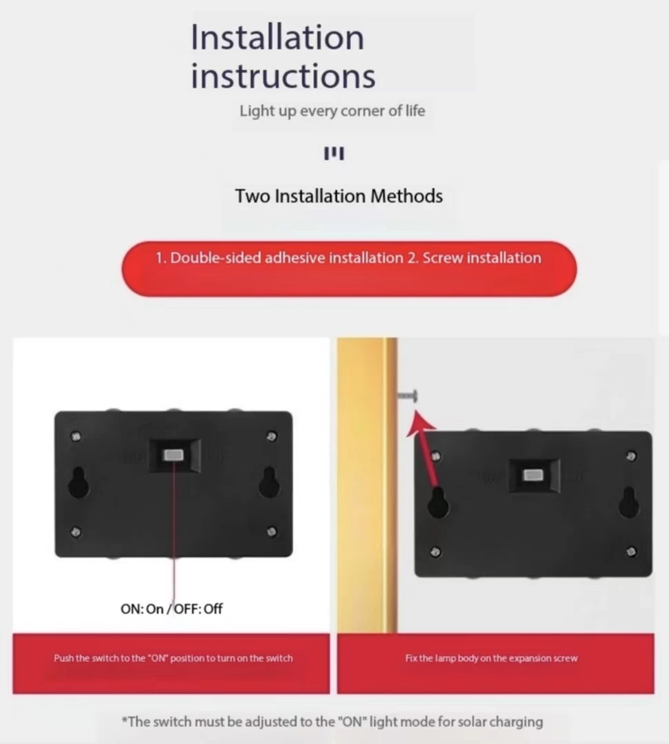 【설치가 용이함】 전선이나 어댑터가 필요하지 않습니다.포함된 나사나 양면테이프를 이용하여 벽에 고정할 수 있습니다.벽 램프를 설치하기 전에 켜기/끄기 버튼을 눌러 켜십시오. 그러면 태양광 벽 램프가 햇빛에 충전되고 밤에 정상적으로 조명될 수 있습니다.