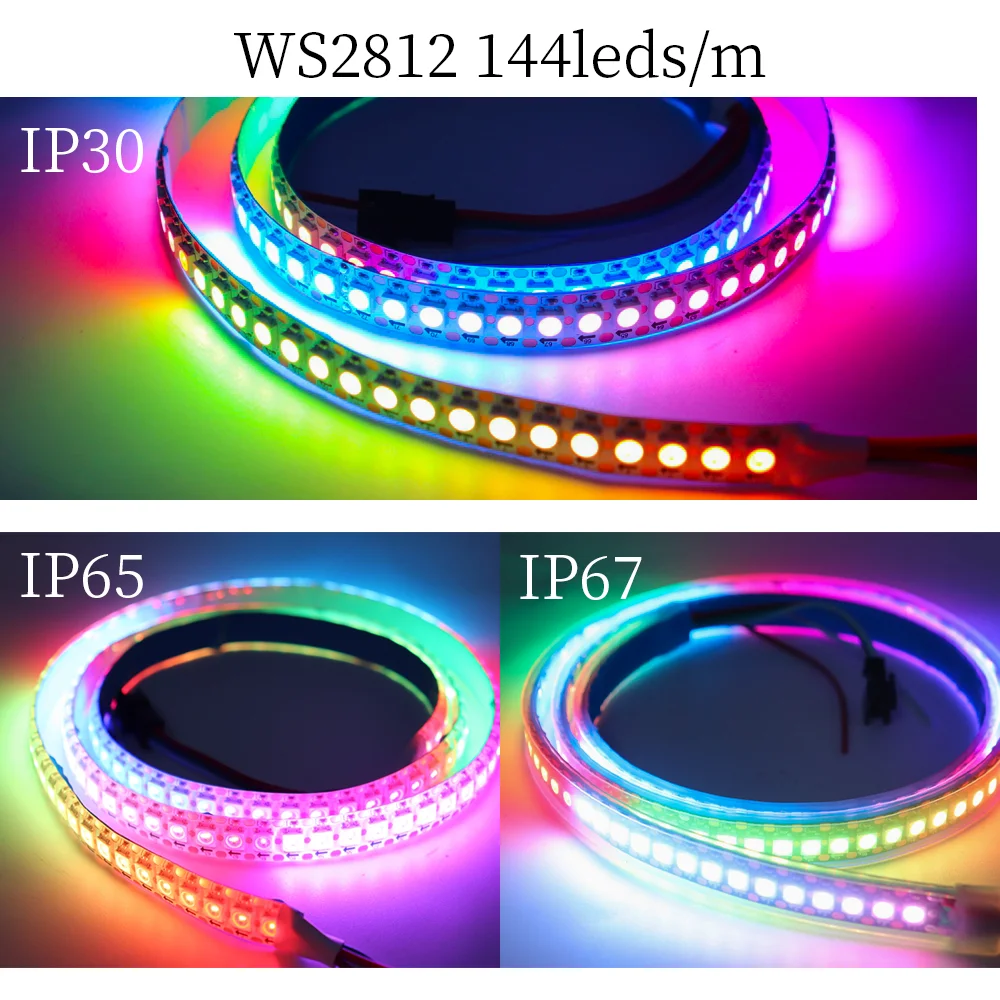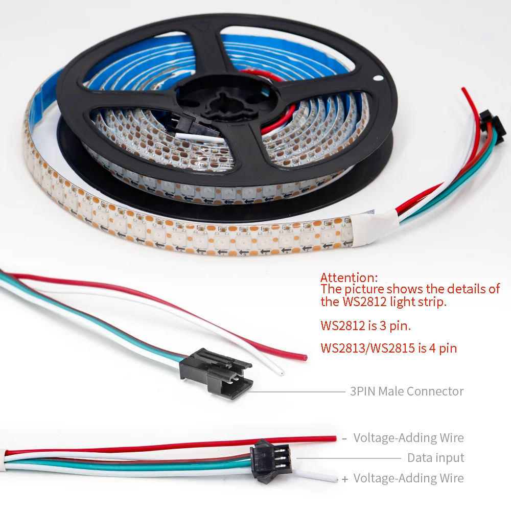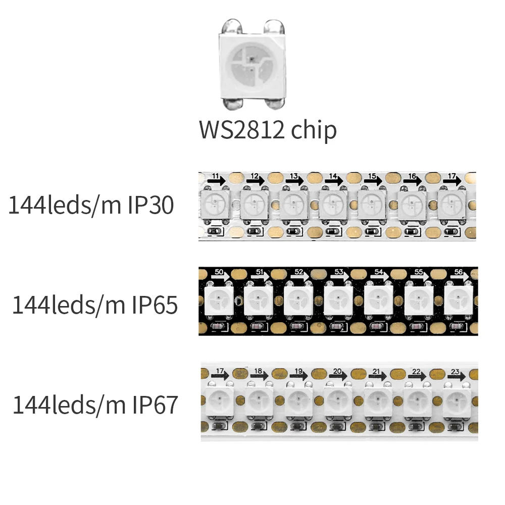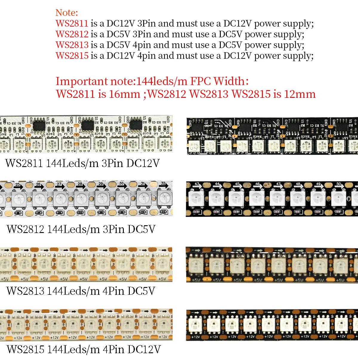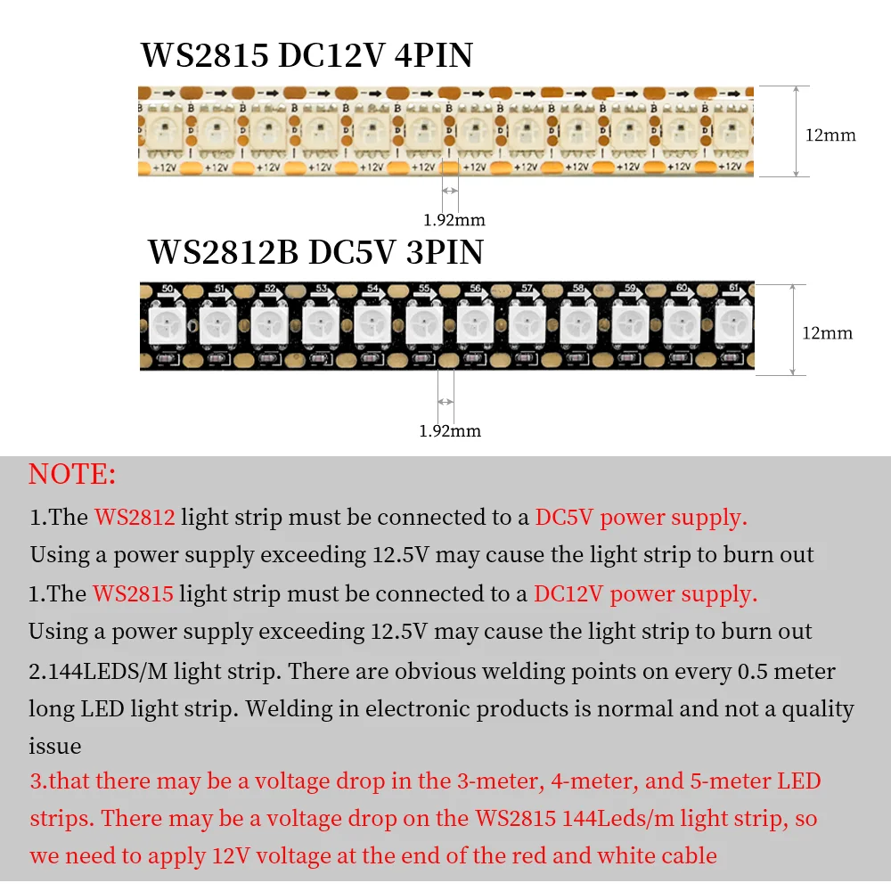 참고3미터,4미터,5미터 WS2812B WS2813 144Leds/m 전압 강하가 있을 수 있습니다. 빨간색과 흰색 케이블 와이어 끝에 5V 전압을 추가해야 합니다.