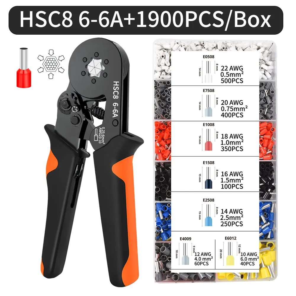 육각 자체 조정 가능한 래칫 페룰 압착 도구 키트 23-7AWG 0.25-10mm ² 크림퍼 키트 (페룰 슬리브 와이어 터미널 포함)
