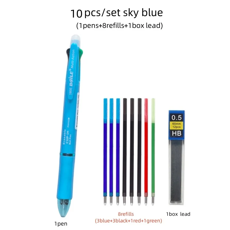 크리에이티브 5 In 1 멀티 컬러 지울 수 있는 젤 펜 볼펜 4가지 색상 0.7mm 교체 가능한 펜 리필 1pc 0.5mm 자동 연필 리드 문구 사무용품(1펜+8리필+1박스 리드 코어)