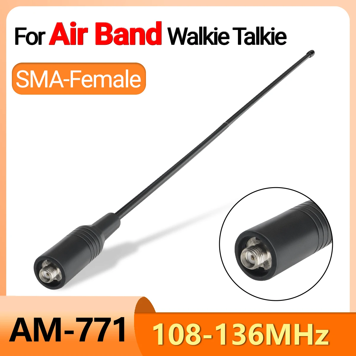 【사양】커넥터: SMA-여성 주파수 범위: 에어 밴드 108-136MHz; 이득: 3.5dBi; V.S.W.R: 1.5 미만; 최대 입력 전력: 25W; 임피던스: 50옴; 길이: 38CM/14.89인치.