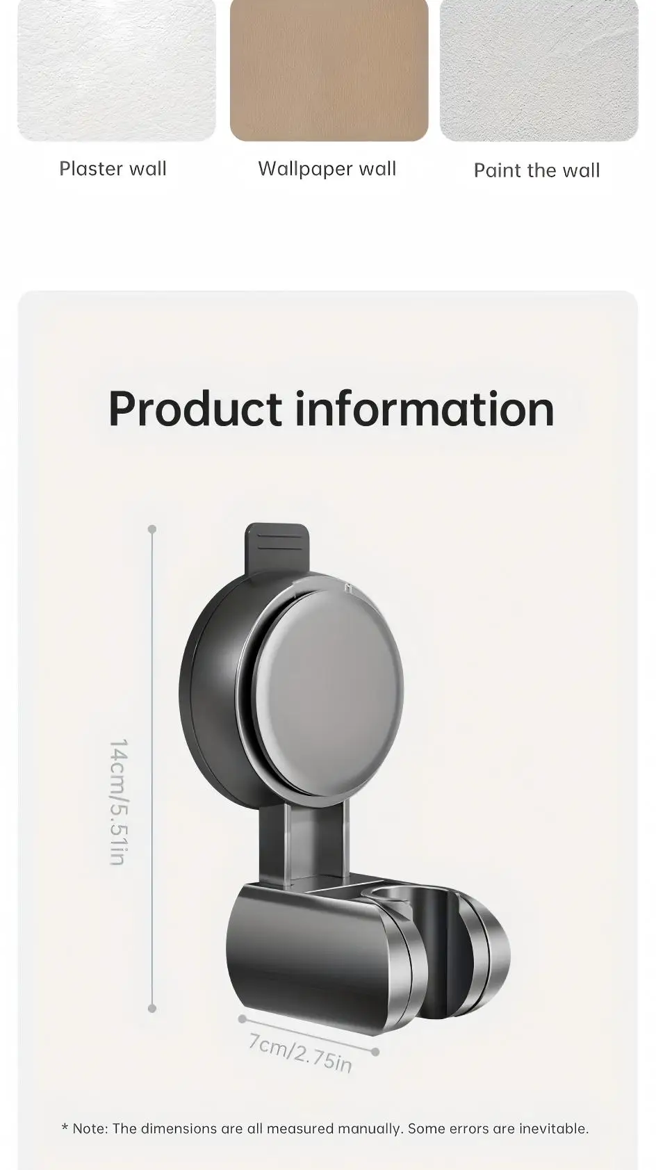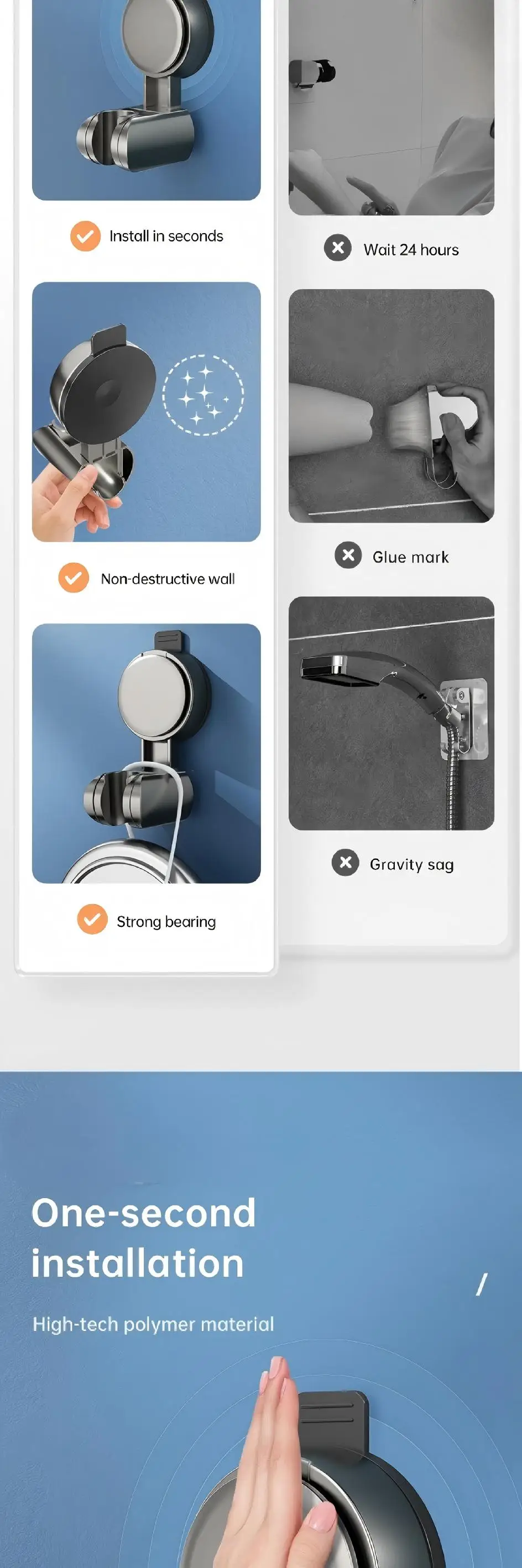 넓은 적용 범위: 더 많은 샤워 헤드에 적합합니다.샤워 장착 브래킷은 세라믹 타일, 대리석, 유리, 매끄러운 목재 등과 같은 매끄러운 표면에 적합합니다.