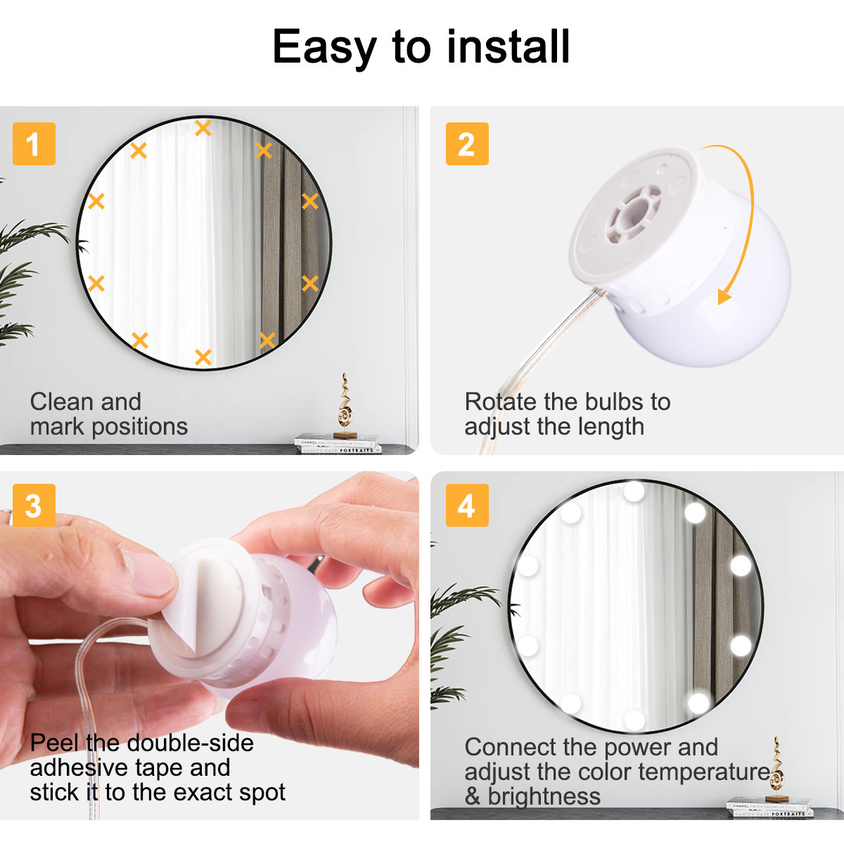 8.Easy to install,It is easy and convenient to use sticker for mirror glass, wood, plastic and metal surface. According to their own unique design DIY installed in the dresser fill light and decoration.