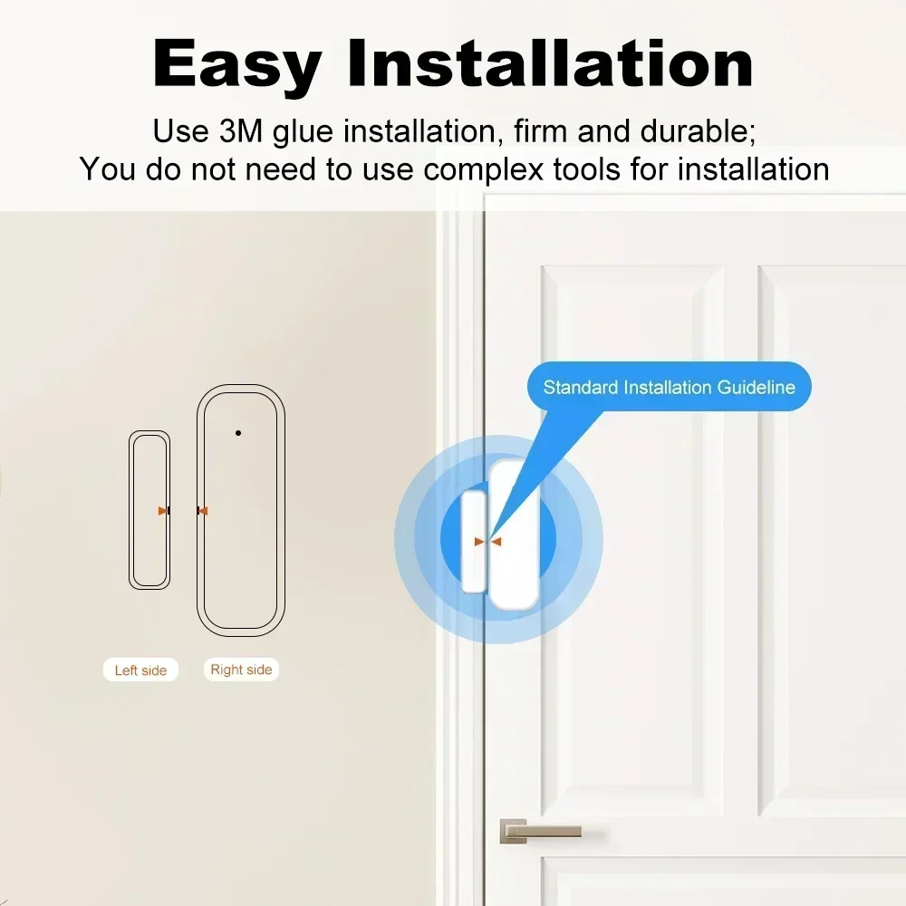 9. 설치가 간편함:복잡한 설치 도구가 필요하지 않습니다.센서는 양면 접착 테이프 또는 나사(포함)를 사용하여 몇 단계만으로 설치할 수 있으며, GooglePlay 또는 App Store에서 "Smart Life" 앱을 다운로드하여 문/창문 상태를 감지하는 장치를 추가할 수 있습니다.