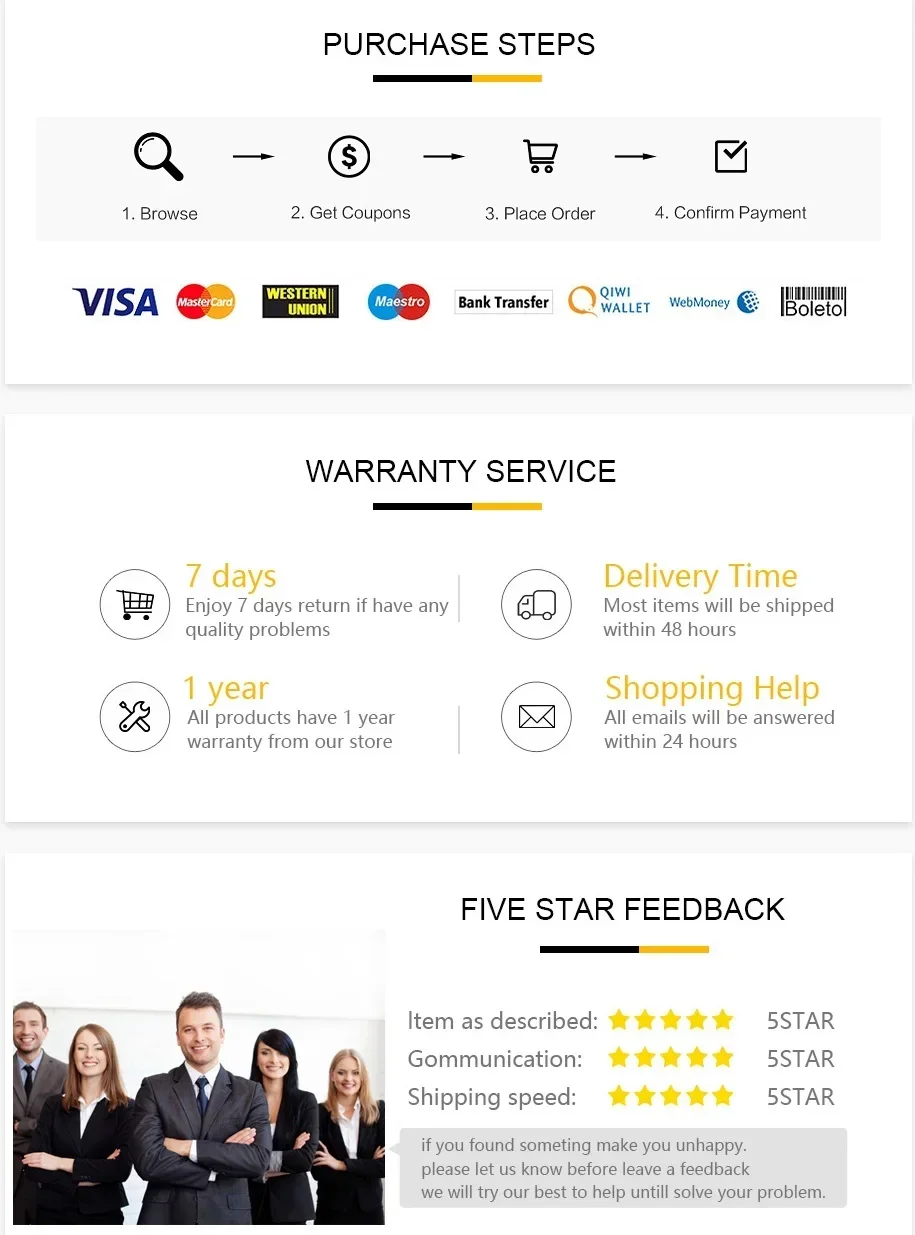 A: 우리는 귀하의 만족에 따라 성공할 수 있으며 귀하의 피드백은 우리에게 확실히 중요합니다. 당신이 당신의 구매에 만족한다면, 우리에게 긍정적인 피드백을 남겨주세요. 제품이나 서비스에 만족하지 못하는 경우 먼저 당사에 문의하십시오! 감사합니다. 5성급 피드백을 남겨주시는 것을 잊지 마세요. 그리고 고객 서비스에 연락하여 깜짝 선물을 받으실 수 있습니다.