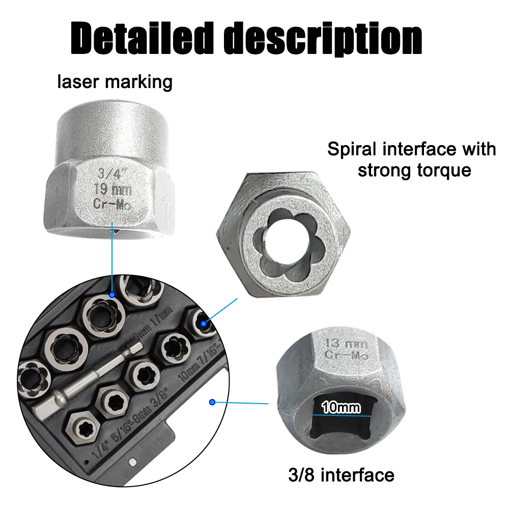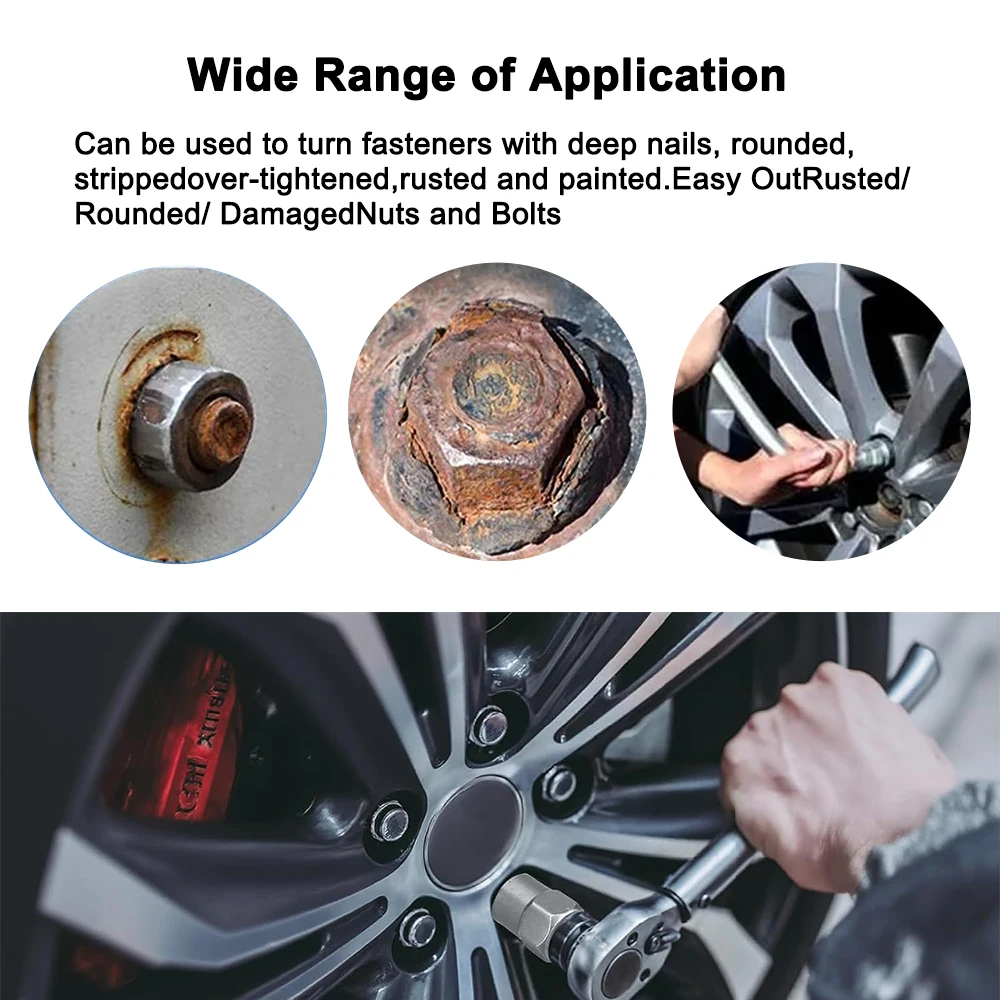 3/8 인터페이스는 3/8 렌치와 함께 사용하거나 3/8 육각 핸들 연장 로드를 조립하여 전동 공구와 함께 사용할 수 있습니다.