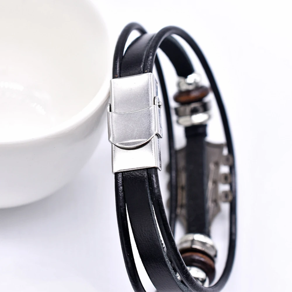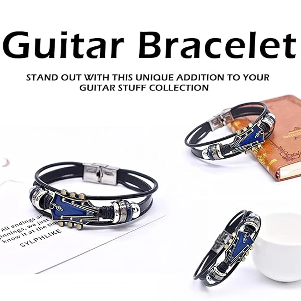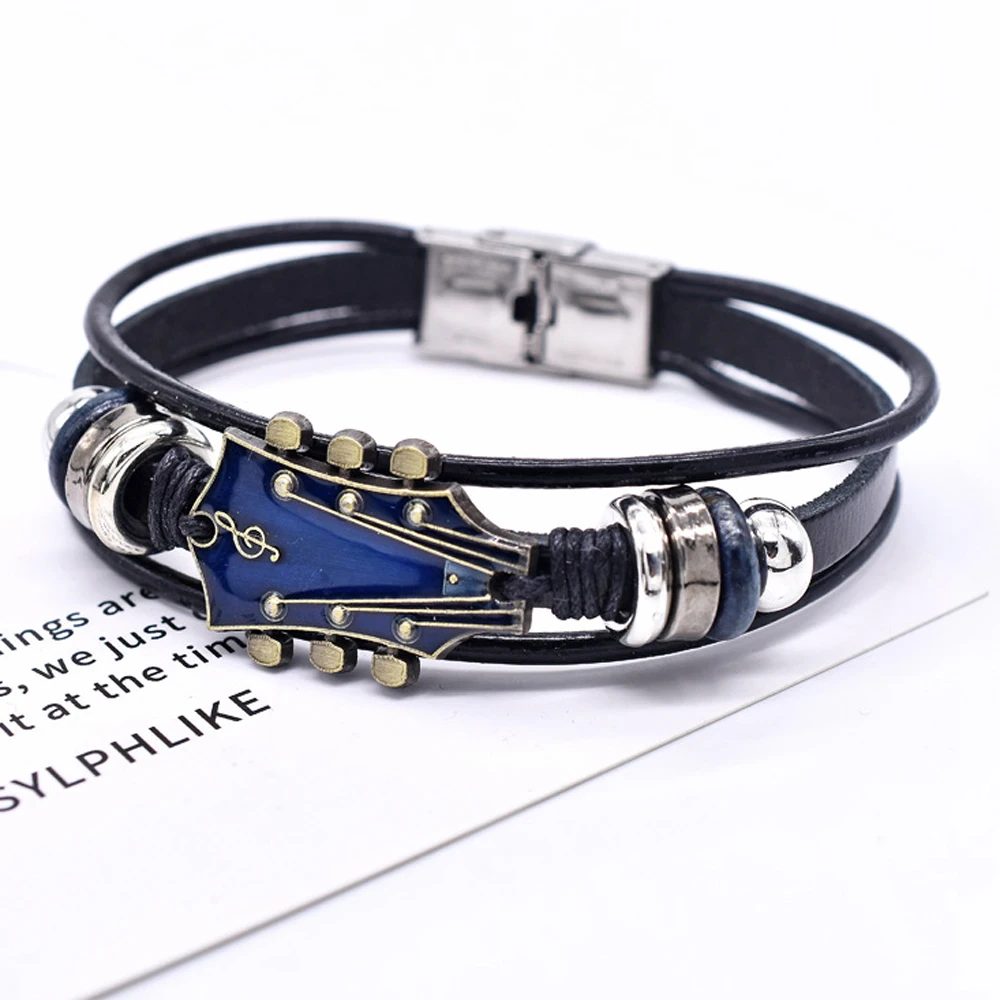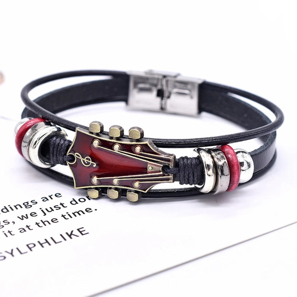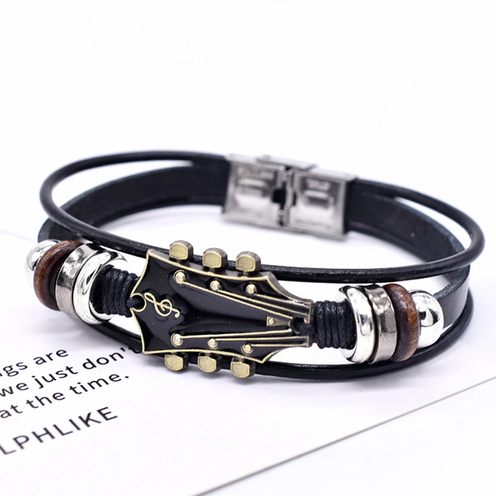 레트로 인조 가죽 기타 팔찌, 록 음악 기타 천연 가죽 팔찌, 남성용 펑크 기타 팔찌, 기타 핸드메이드 브레이드 멀티 레이어 랩 팔찌