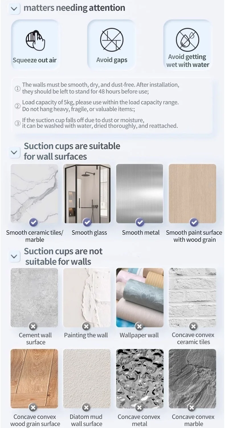 6.흡입 컵을 설치할 때 흡입 컵과 벽이 깨끗한지 확인하십시오.동시에 벽은 균열, 구멍 또는 기타 조건 없이 100% 평평하고 매끄러워야 합니다.