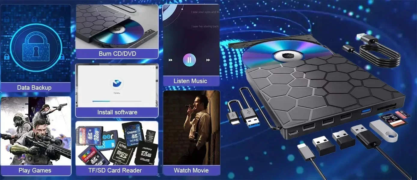 이 외부 CD/DVD 플레이어는 CD 및 DVD 리더일 뿐만 아니라 CD/DVD 버너, 라이터, 리라이터, 레코더, 리퍼 및 다중 포트 허브(USB-A 포트 3개, Type-C 포트 1개, TF/2개)입니다. SD 카드 슬롯).해당 미디어 플레이어/굽기/리핑 소프트웨어를 사용하여 영화 DVD/음악 CD를 재생하고, mp3 음악, 비디오, 사진 및 파일을 빈 CD 또는 DVD에 굽고, 카메라에서 컴퓨터로 비디오, 사진을 가져오고, 소프트웨어, 시스템을 설치할 수 있습니다. , 게임 및 CD/DVD와 관련된 기타 모든 것.