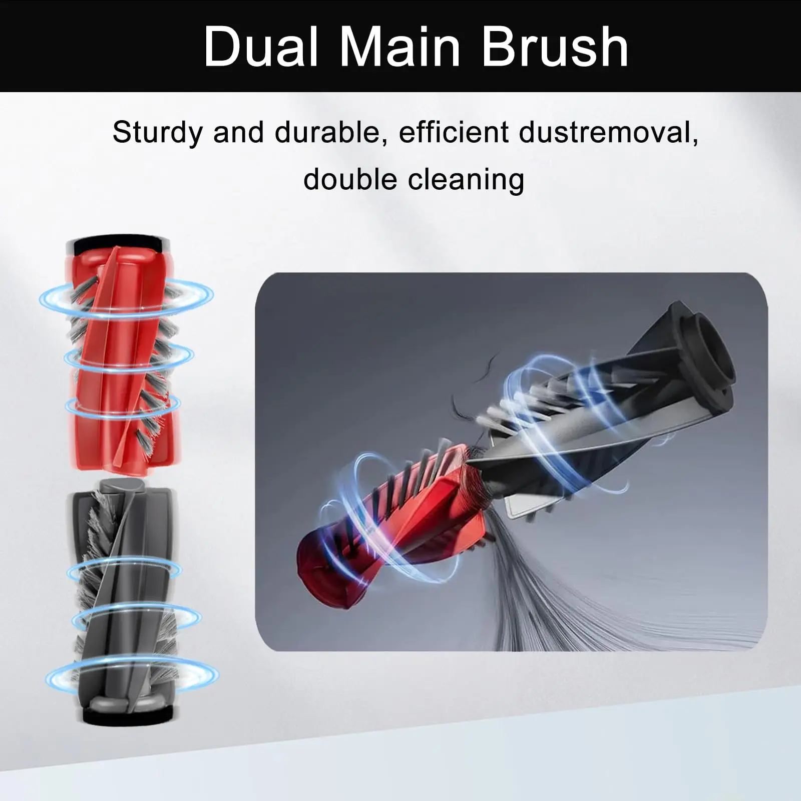 듀얼 브러쉬:빨간색 + 회색 롤러는 긁힘 없이 모든 바닥(단단한 나무/카펫)에서 잔해물 수거를 강화합니다.