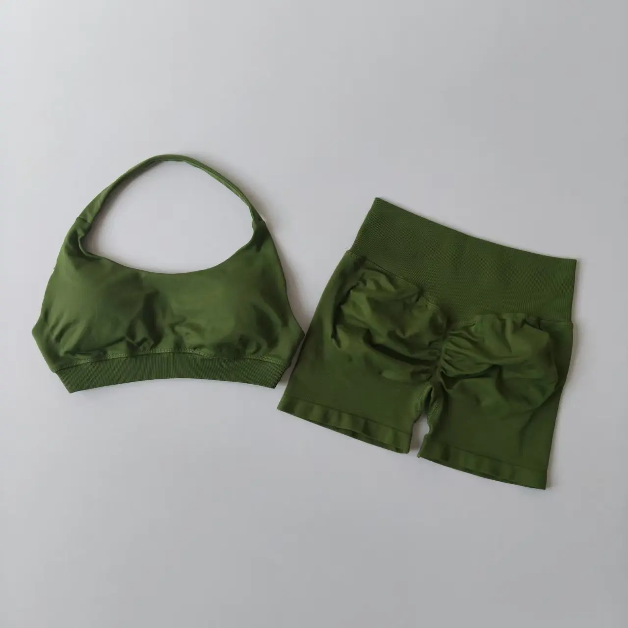 섹시한 홀터넥 넥 아름다운 뒤 높은 허리 복숭아 스포츠 브래지어 반바지 정장 필라테스 수집 요가 조끼 훈련 피트니스 브래지어 세트