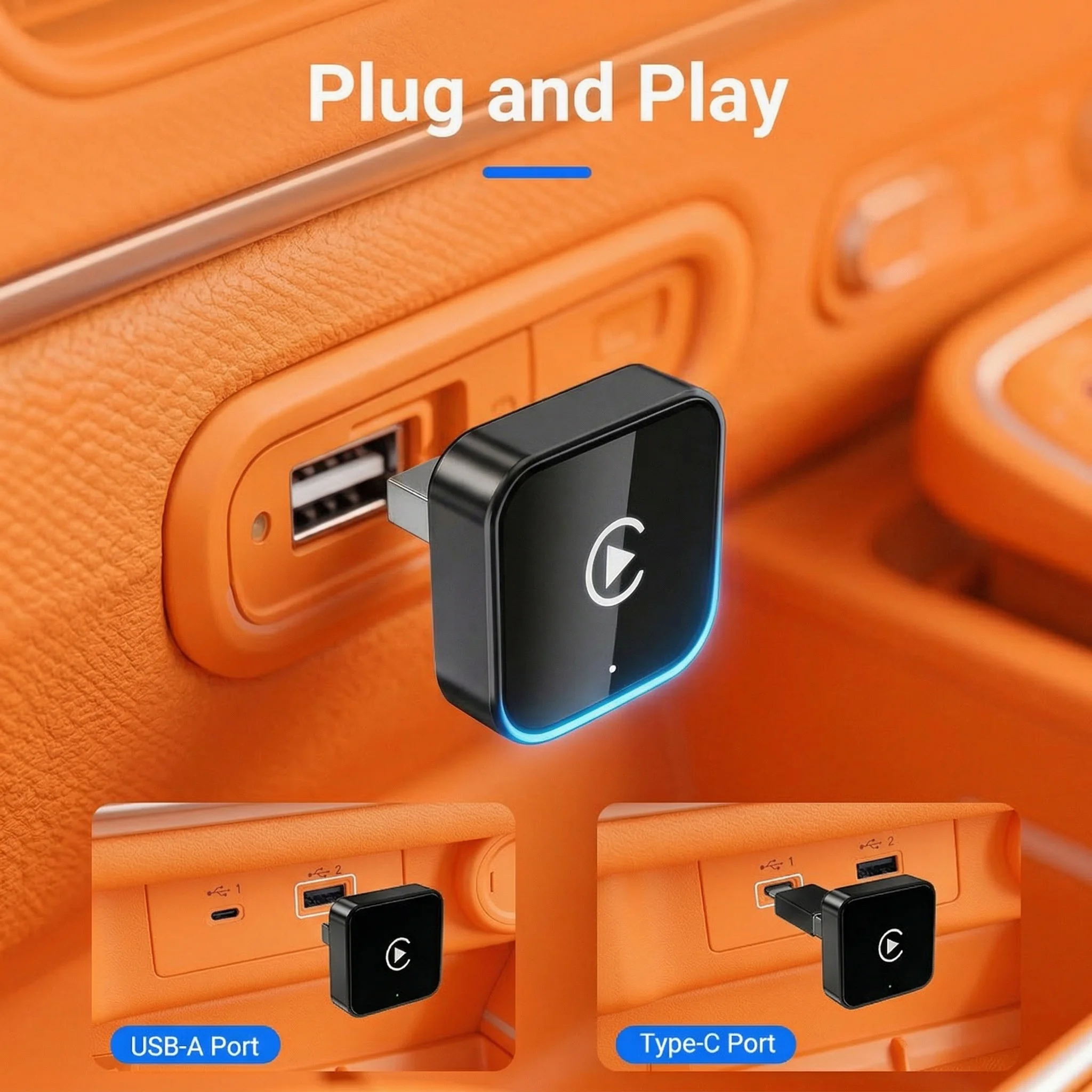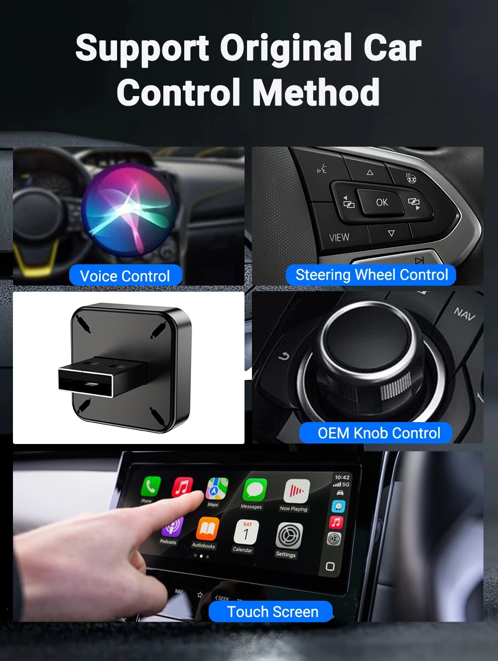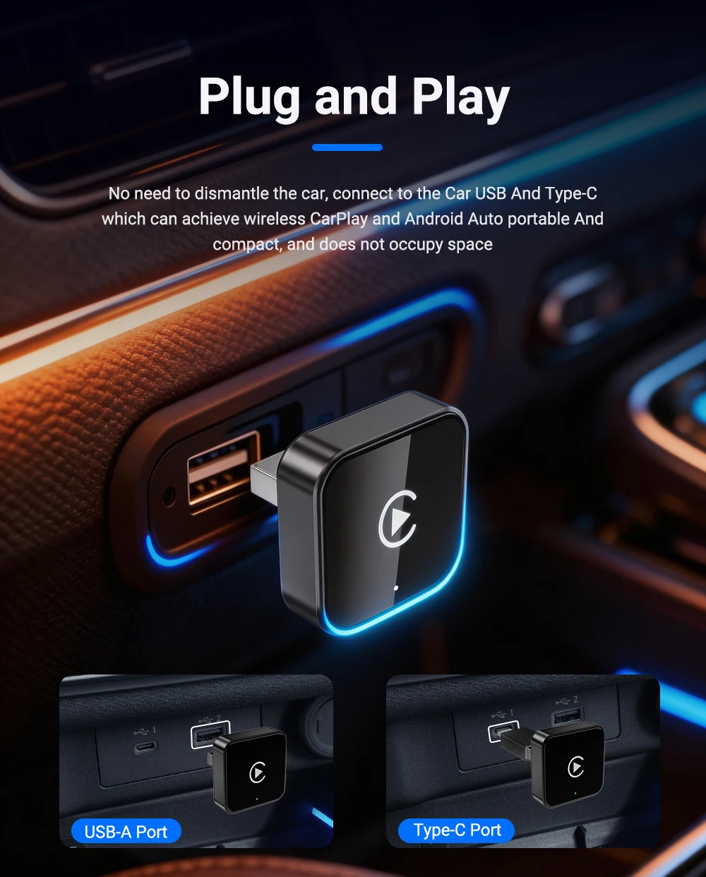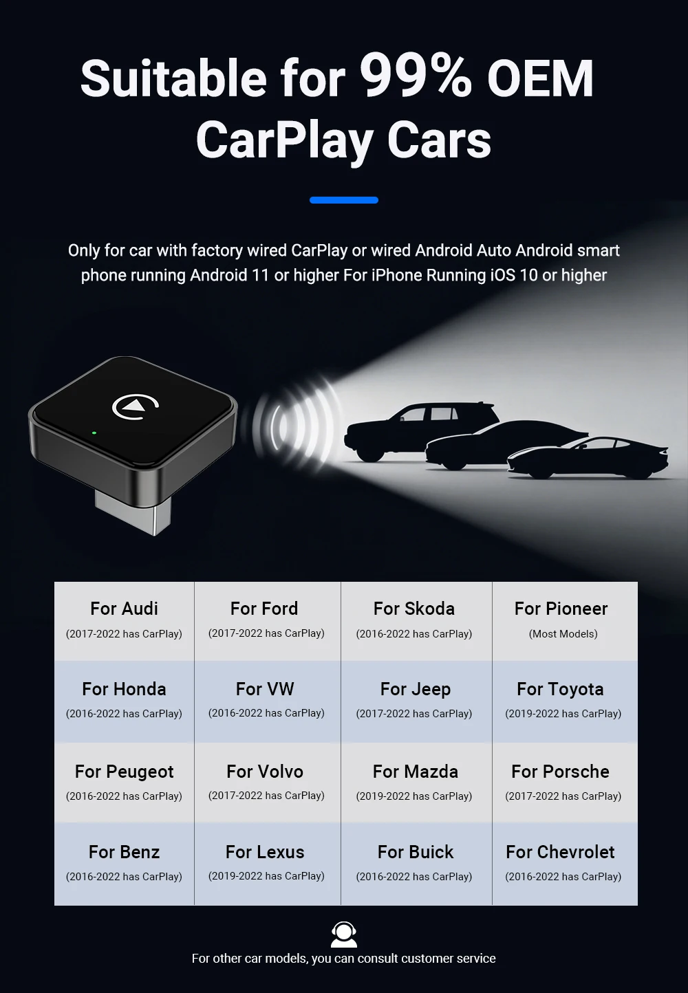 1. 유선 CarPlay를 무선으로 변환하는 어댑터, 이제 선과 작별하세요. USB 플러그 앤 플레이 설치, 안정적이고 빠른 연결, OEM 라디오를 제거할 필요 없음.