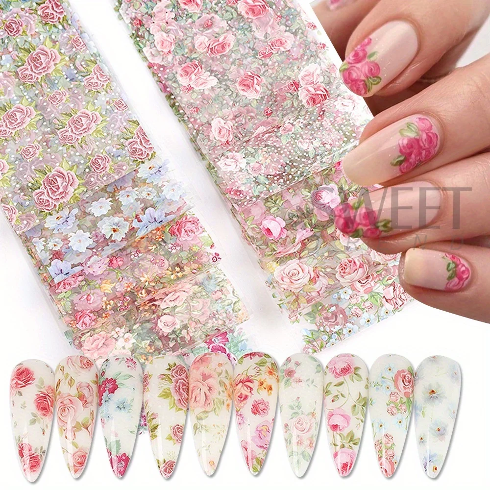 10PCS 혼합 네일 아트 호일 전송 스티커 세트 장미 꽃 디자인 꽃 별이 빛나는 하늘 네일 랩 웨딩 여름 매니큐어 장식