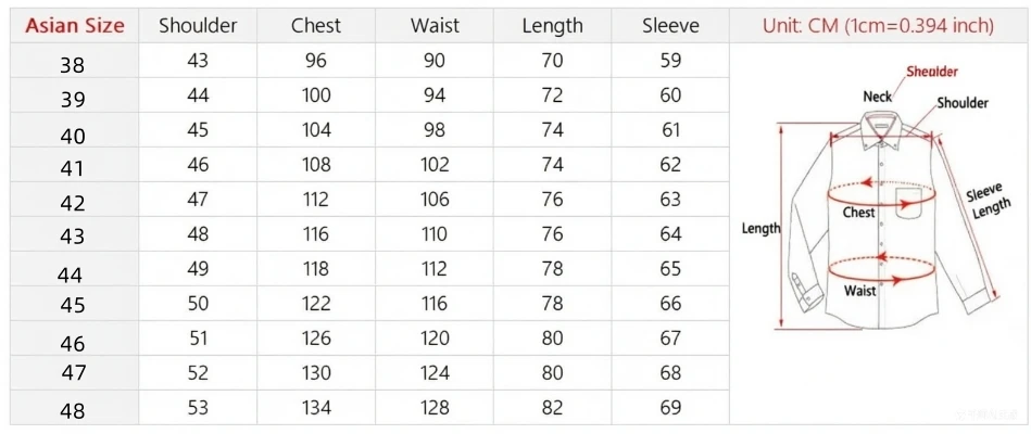 2) 일반적으로 셔츠 사이즈는 신체 사이즈보다 크게 선택하는 것이 좋습니다. 평소 입는 셔츠를 확인해 보세요. 만약 가슴둘레가 100cm라면, 104cm 또는 108cm 사이즈의 셔츠를 선택하는 것을 추천합니다. 이 제품은 슬림 핏으로, 평소 사이즈보다 한 사이즈 크게 구매하는 것을 권장합니다.
