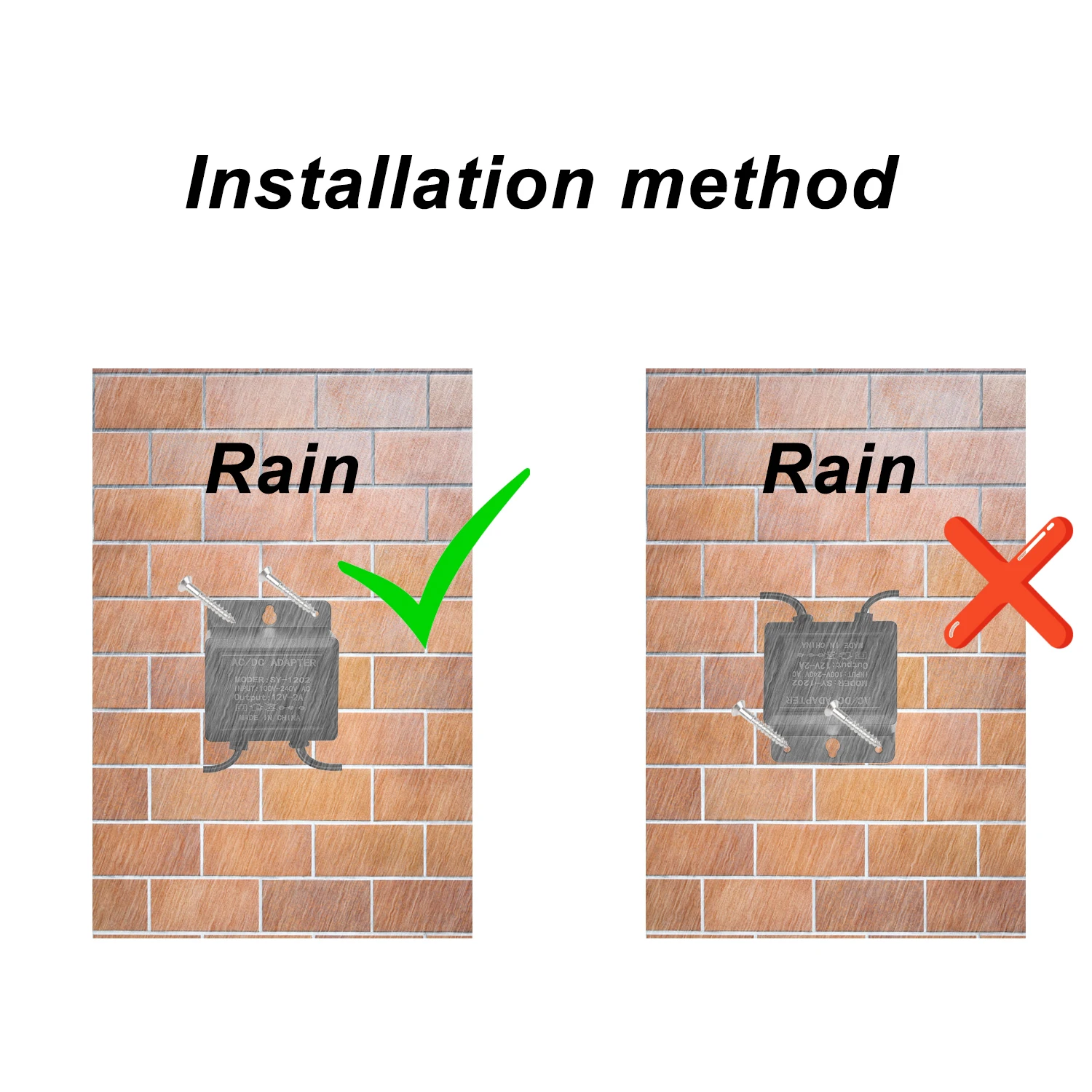 전원 어댑터를 나사 위치가 위를 향하도록 설치하십시오.빗물을 방지할 수만 있고 수중 작업은 지원하지 않습니다.