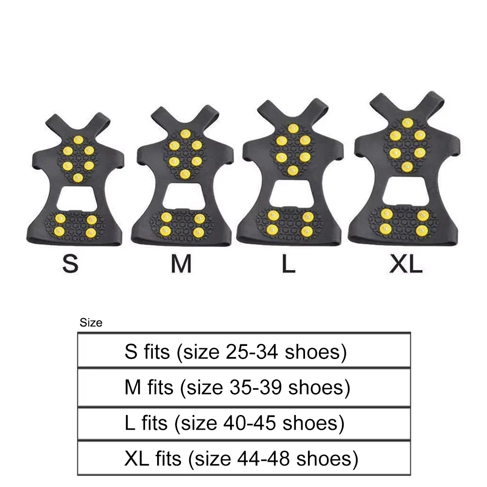1. 다재다능한 야외 견인력: 야외 하이킹과 눈 활동에 안정적인 견인력을 제공하는 이 10개의 이빨 겨울 얼음 발톱의 다용성을 경험해 보세요.다양한 신발 크기에 적합하며 얼음이 있거나 미끄러운 표면에서 향상된 안정성을 제공합니다.