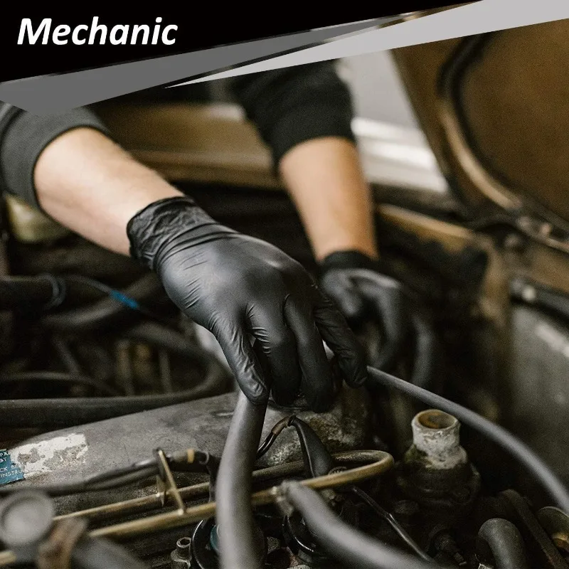 전문적이고 세련된- 검정색 일회용 장갑은 니트릴로 만들어졌습니다.다양한 저농도 오일 그리스, 브레이크 클리너, 가벼운 용제에 대한 방수 및 내성이 있습니다.