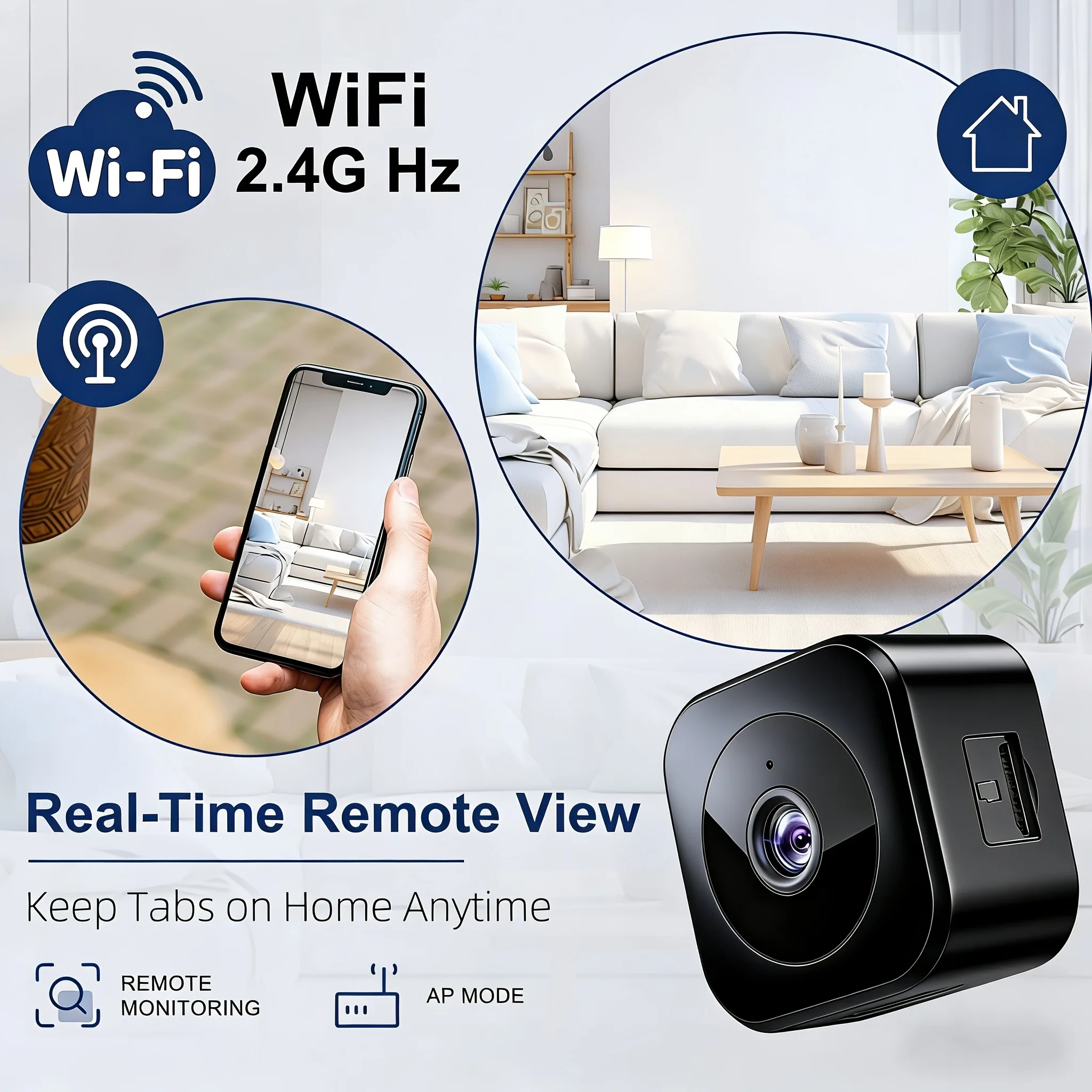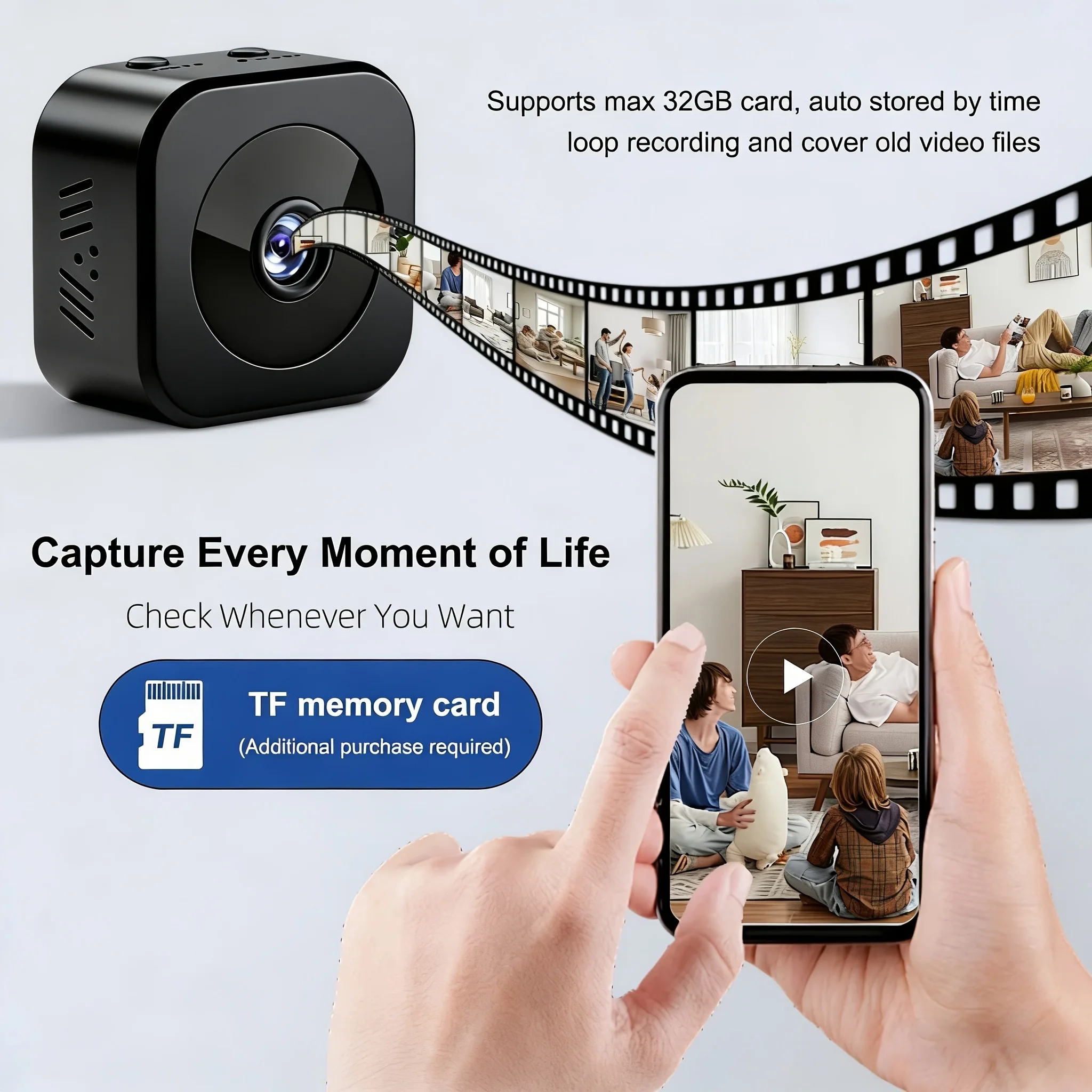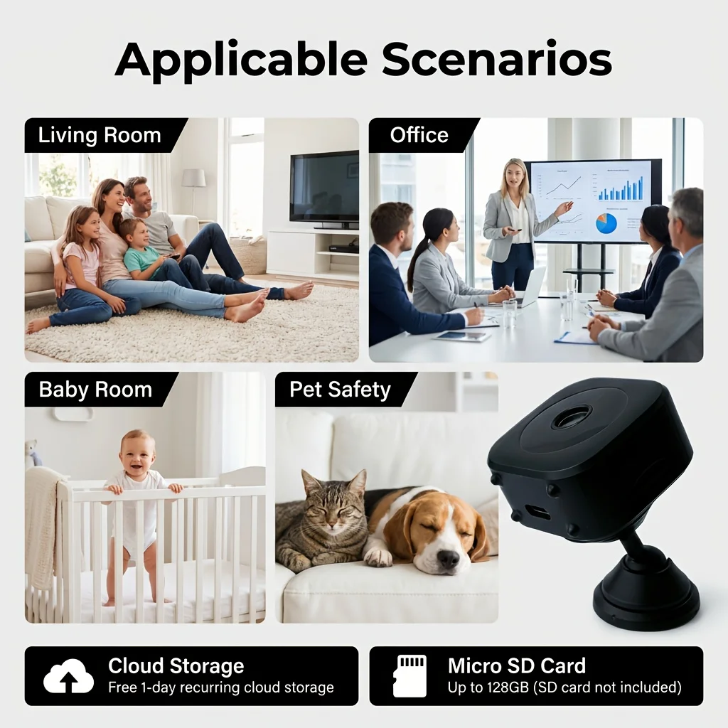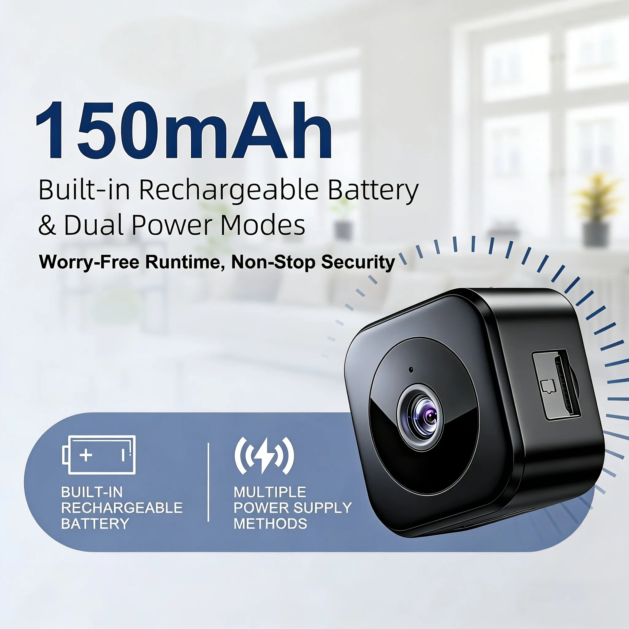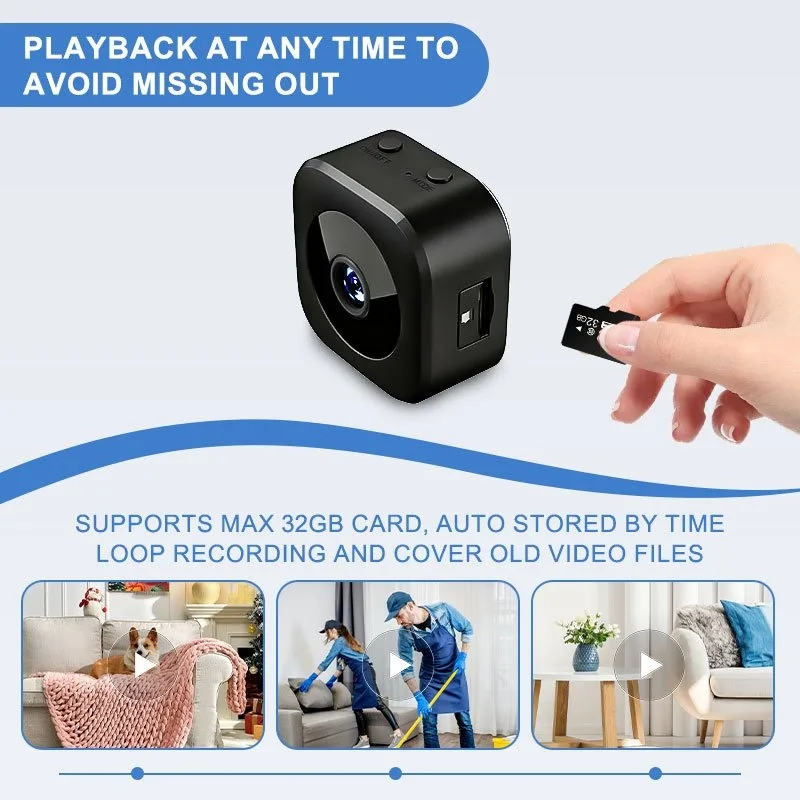 7. 최대 128GB 메모리 카드 지원, 자동 야간 투시, 동작 감지 및 순환 녹화 기능 제공, 전원 연결 시 모니터링 및 녹화 가능.