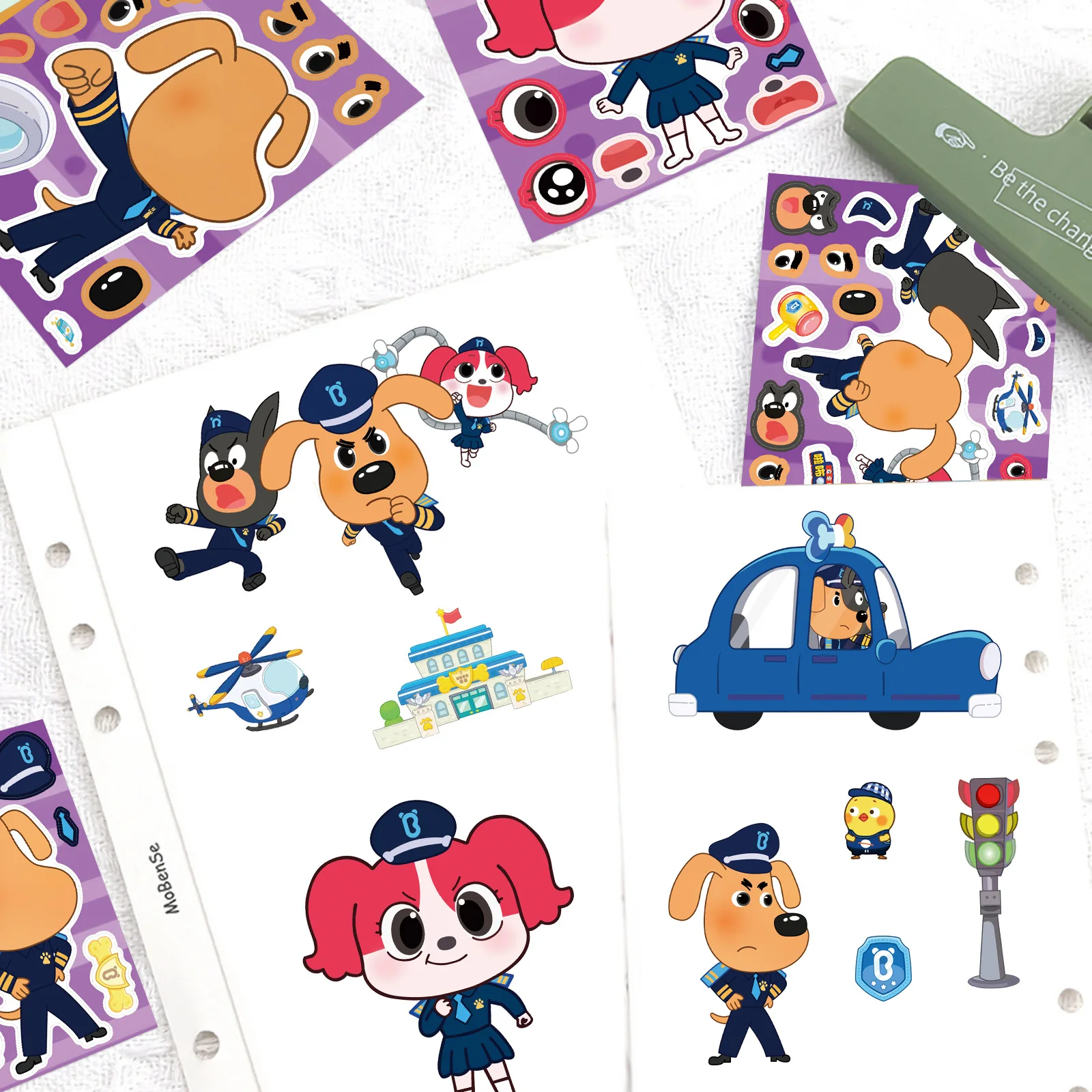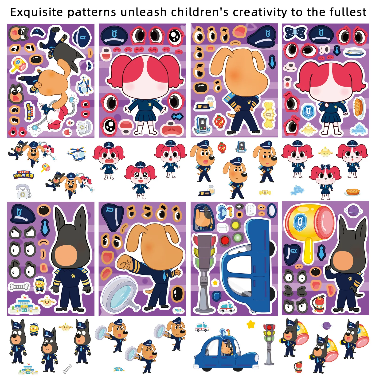 8 시트 만화 개 보안관 얼굴 만들기 퍼즐 스티커 어린이 DIY 게임 만들기 어린이 퍼즐 교육 장난감