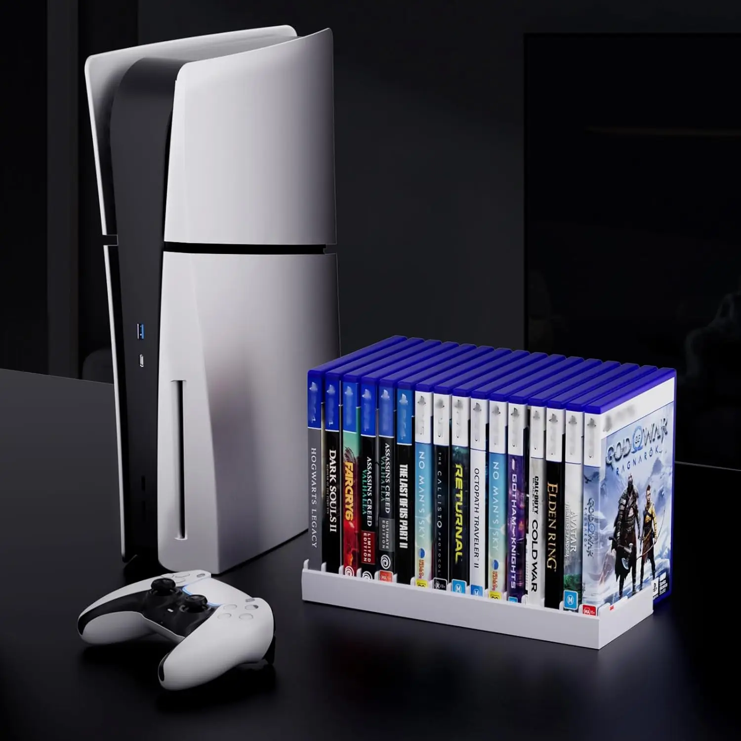 미끄럼 방지 디자인 - 고경도 ABS 소재로 제작되었으며 바닥에 미끄럼 방지 실리콘이 특징인 플레이스테이션 게임 디스크 랙은 낙하로부터 안정적이고 안전한 보호 기능을 제공하여 소중한 게임 디스크를 항상 안전하게 유지합니다.