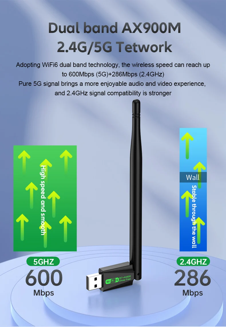 ●무선 네트워크 카드의 WIFI 전송 속도는 라우터와 작업 환경에 따라 다릅니다.최대 900Mbps(2.4GHz 286Mbps+5GHz 600Mbps)를 지원하므로, 네트워크 대역폭 속도가 900Mbps를 지원하는지 확인하시기 바랍니다.Wi-Fi 6 시리즈 라우터와 함께 사용하면 더욱 원활한 인터넷 경험을 제공합니다.