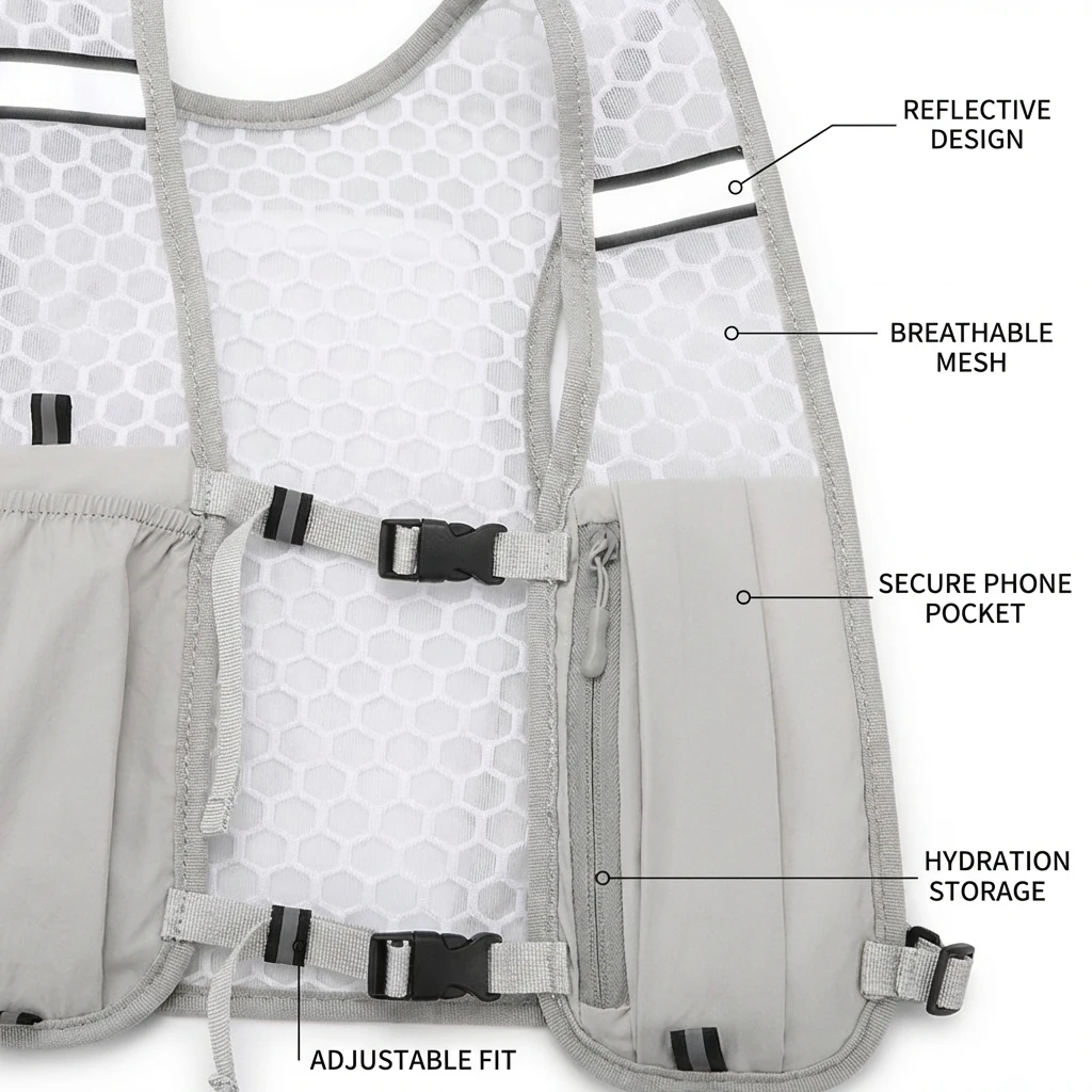 정리된 저장 시스템여러 개의 전용 포켓이 휴대폰, 물병, 에너지 젤, 작은 장비를 보관할 수 있어 러닝, 하이킹, 또는 사이클링 중에도 모든 물건을 제자리에 유지합니다.