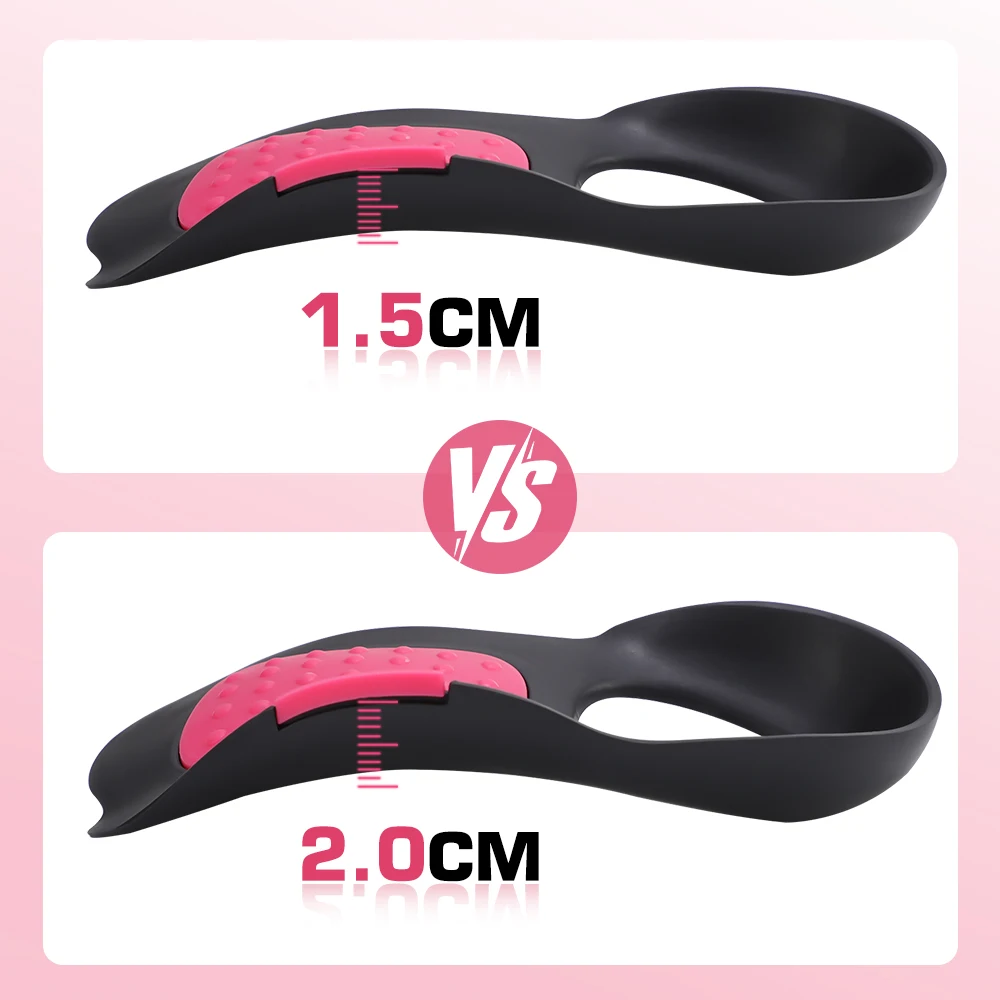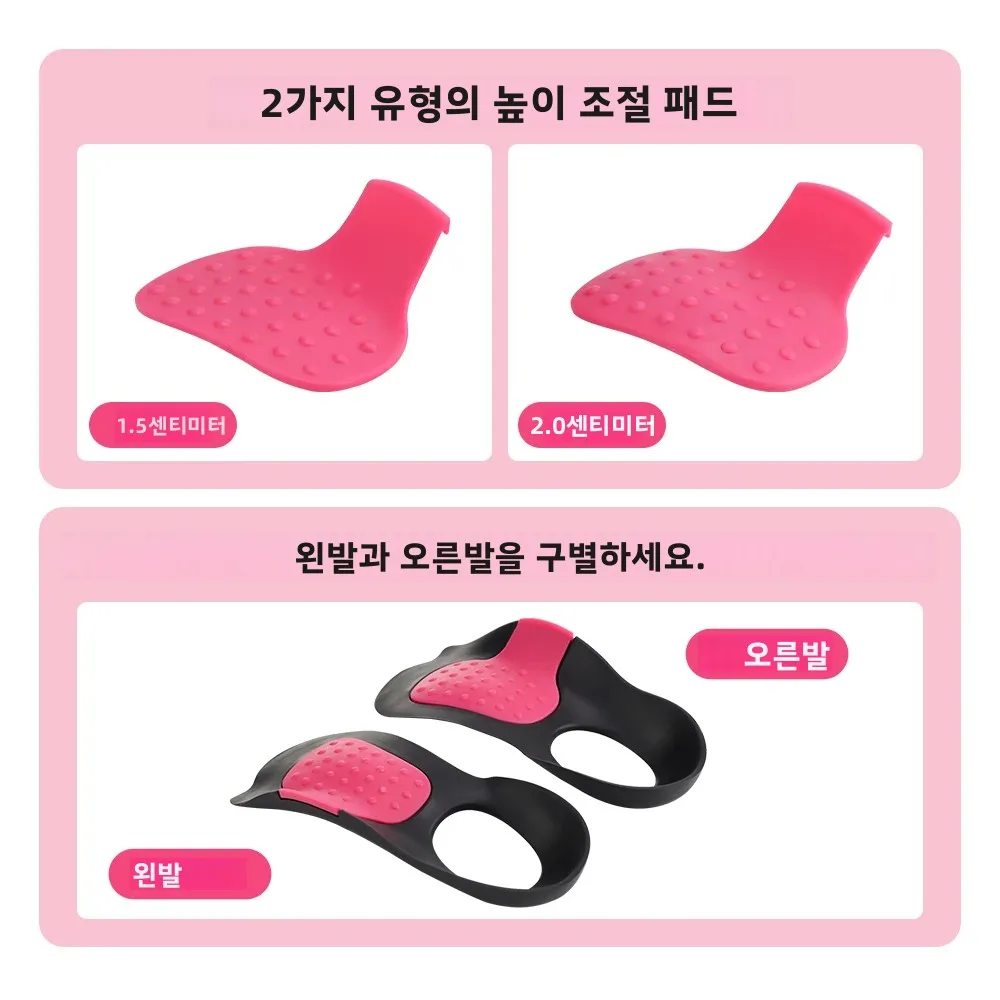 1.이 발바닥 지지 패드는 속이 빈 뒤꿈치 디자인과 탈착식 아치 지지대를 특징으로 하며, 교체 가능한 패드 2종(1.5cm & 2.0cm)이 포함되어 있어 아치를 편안하게 재정렬할 수 있도록 단계별 높이 조절이 가능합니다.
