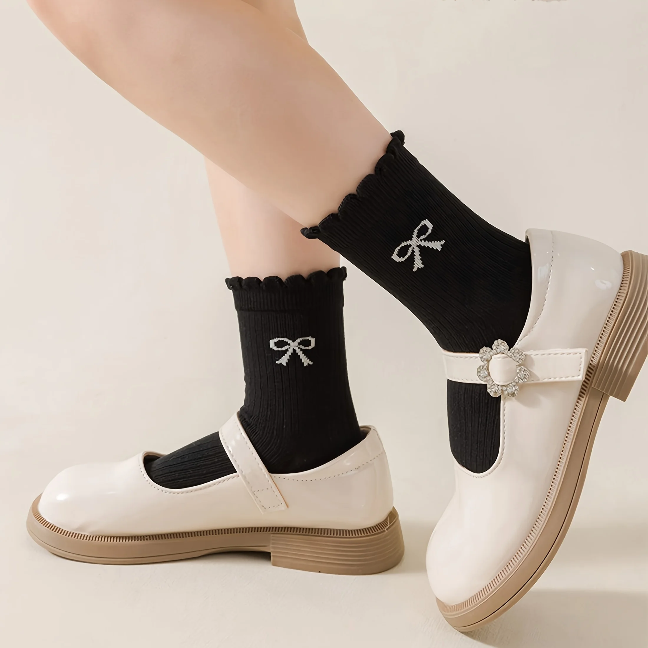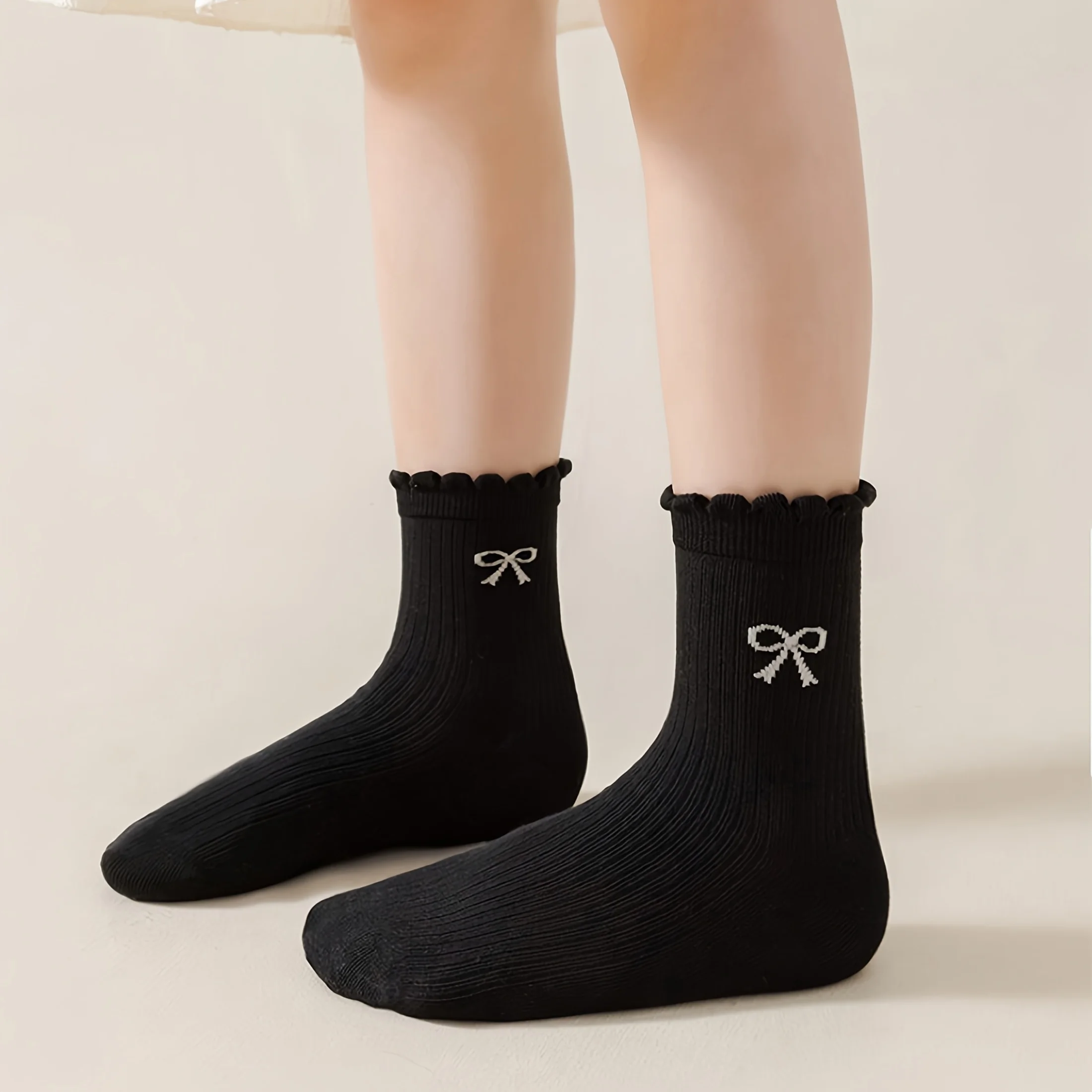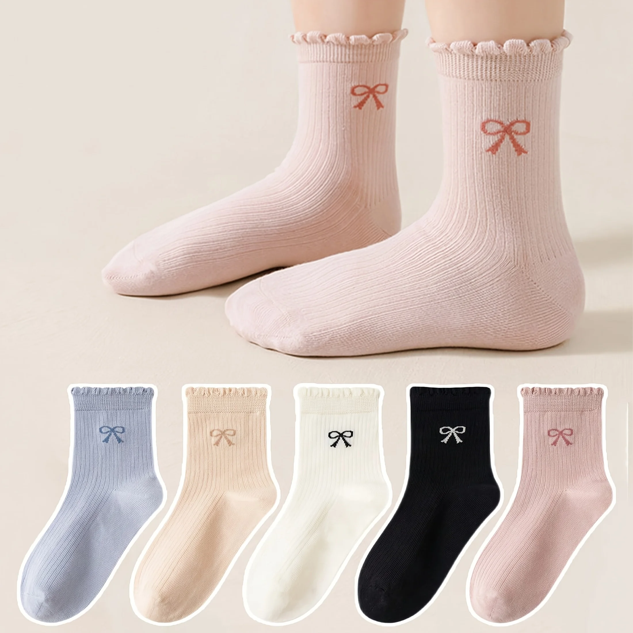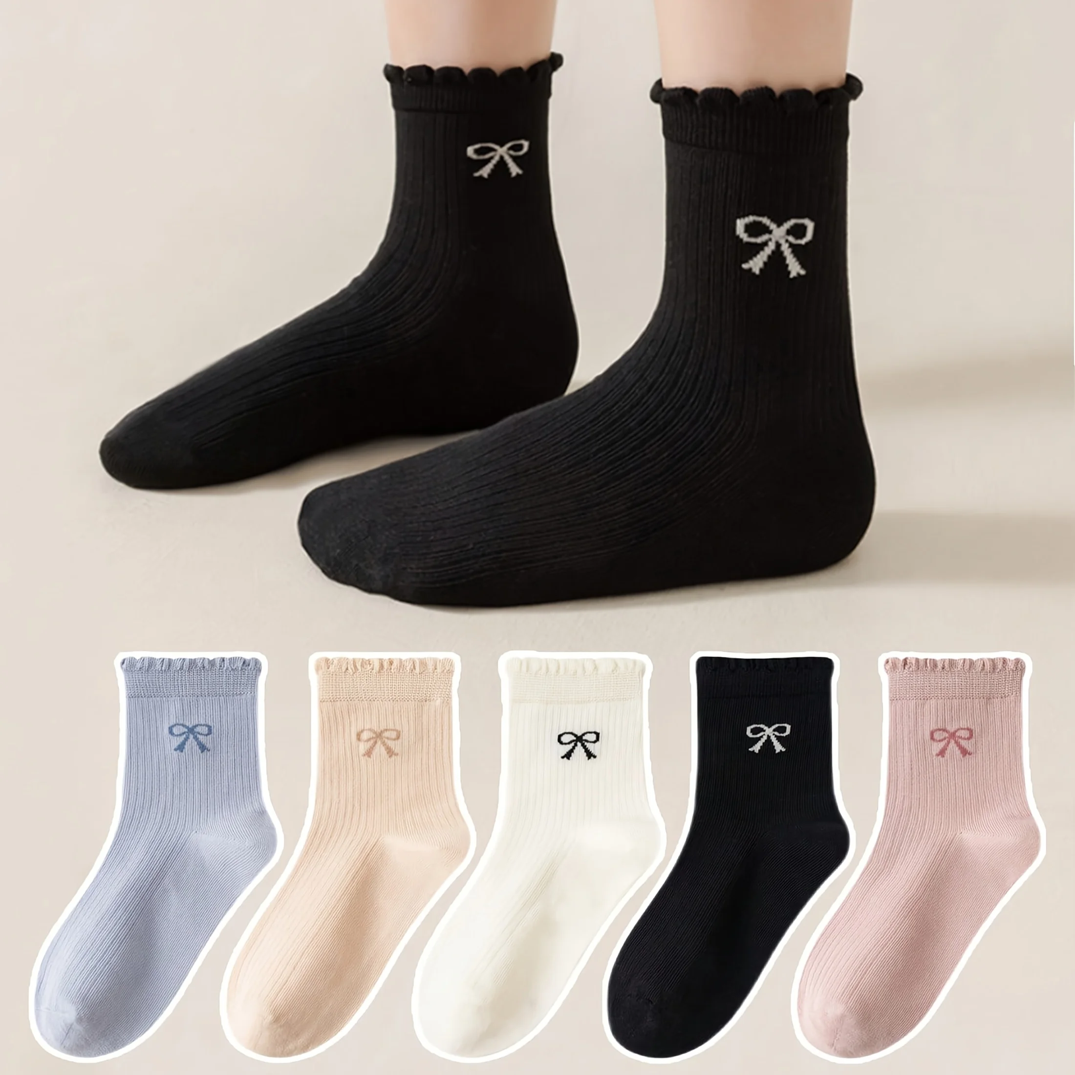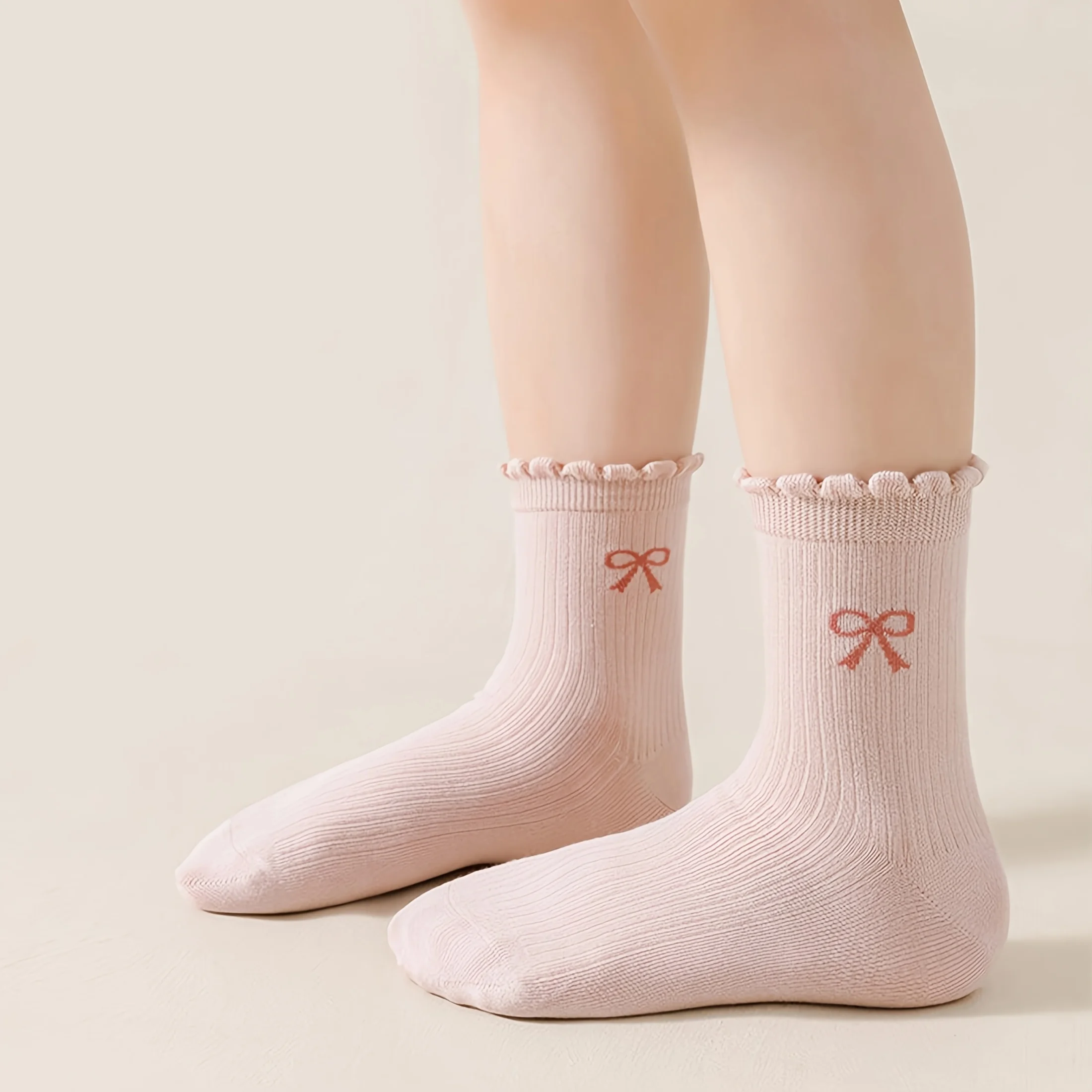 여아 및 유아용 레이스 리본 패턴이 있는 무작위 혼합 색상 아동용 양말 3쌍, 일상 생활에 적합한 사계절 다용도 종아리 중간 양말