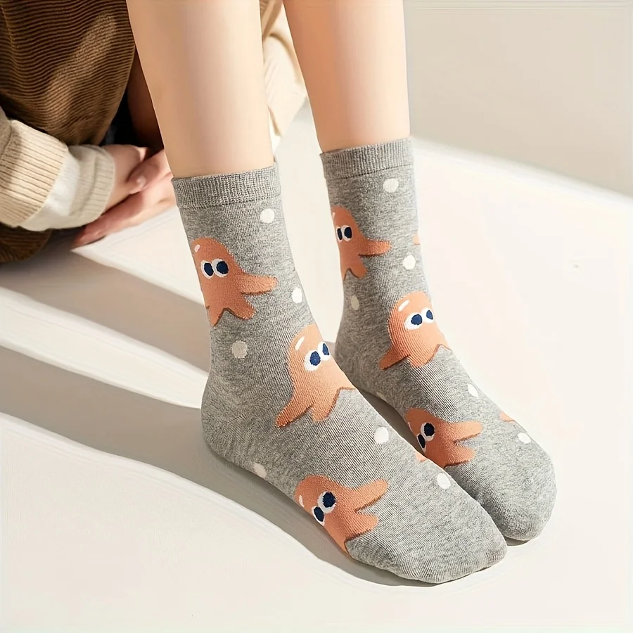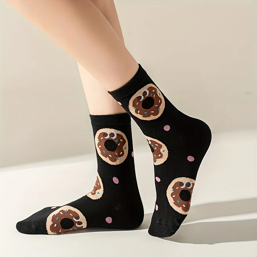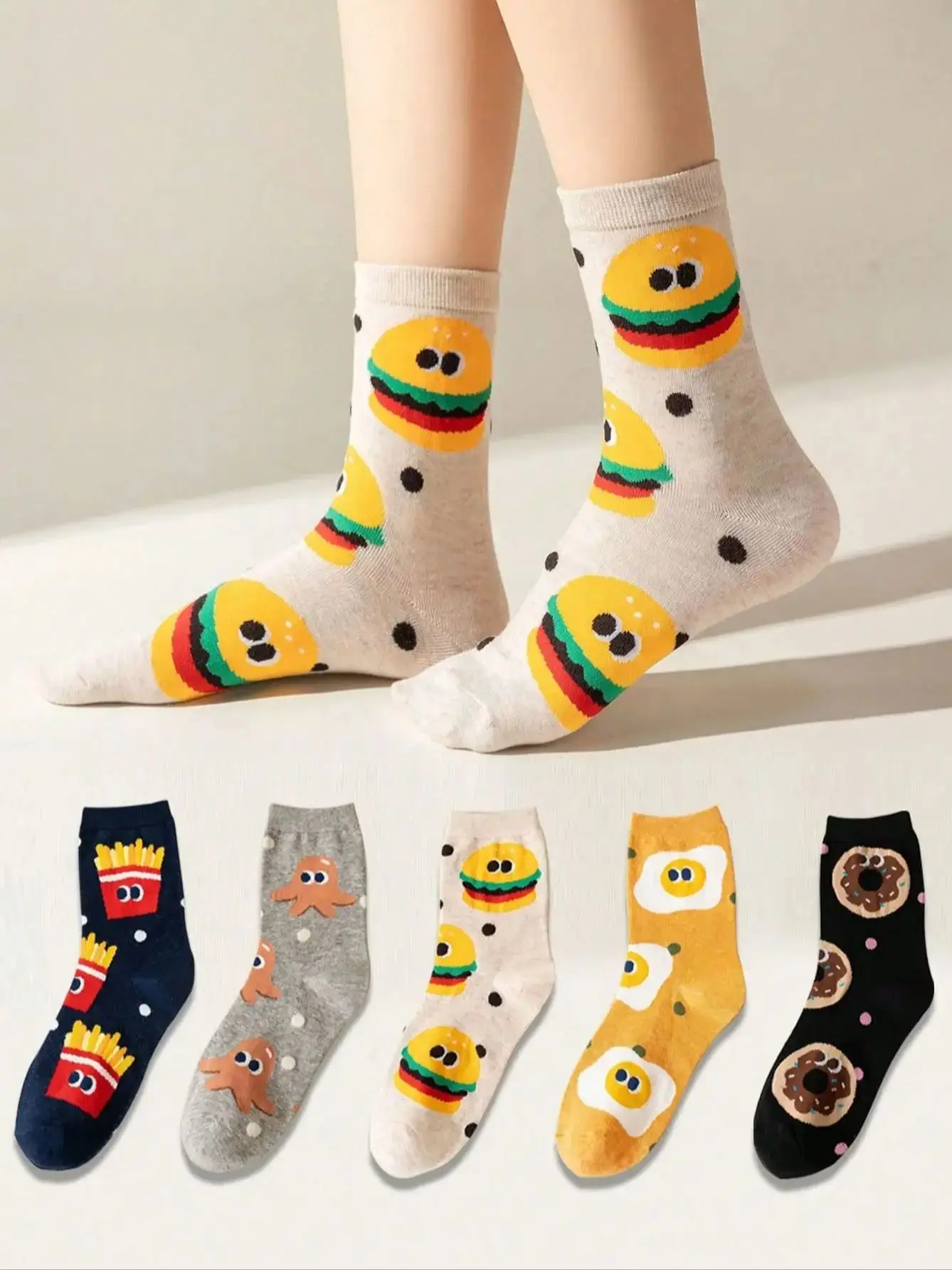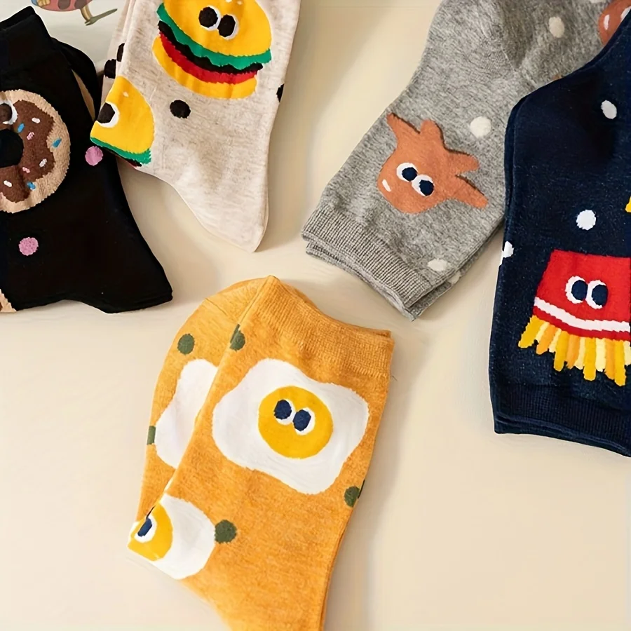 소년과 소녀를 위한 만화 귀여운 햄버거와 감자 튀김 패턴이 있는 혼합 색상 어린이 양말 5쌍, 트렌디하고 다재다능한 청소년 종아리 중간 양말, 캐주얼 일상 생활에 적합